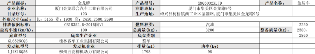 金龙牌XMQ5032XLJD型旅居车是在已公告的五菱牌GL6525CQS型客车基础上,拆除部分座椅,装配旅居专用装置,其他不变而成的新产品。该车装备有炊事设施、床、卫生间等设备,用于旅行宿营;该车有OBD;安装限速装置,限速为100km/h;安装具有卫星定位功能的行驶记录仪;