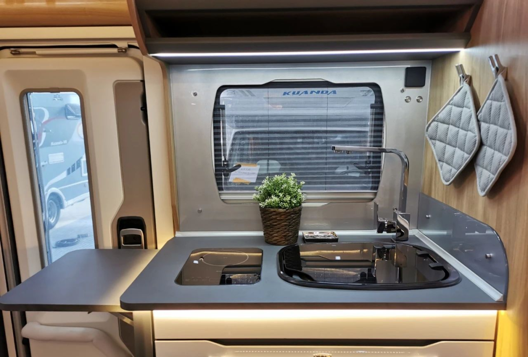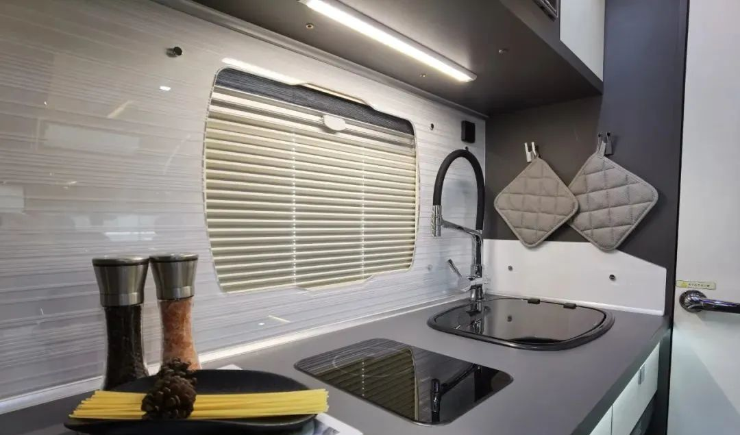 ● 室内厨房配有1300W电磁炉加多功能水槽,整齐精致,加宽折叠桌板。抽拉式外部燃气灶,燃气灶的上方设计了调料存放区,人性化设计;