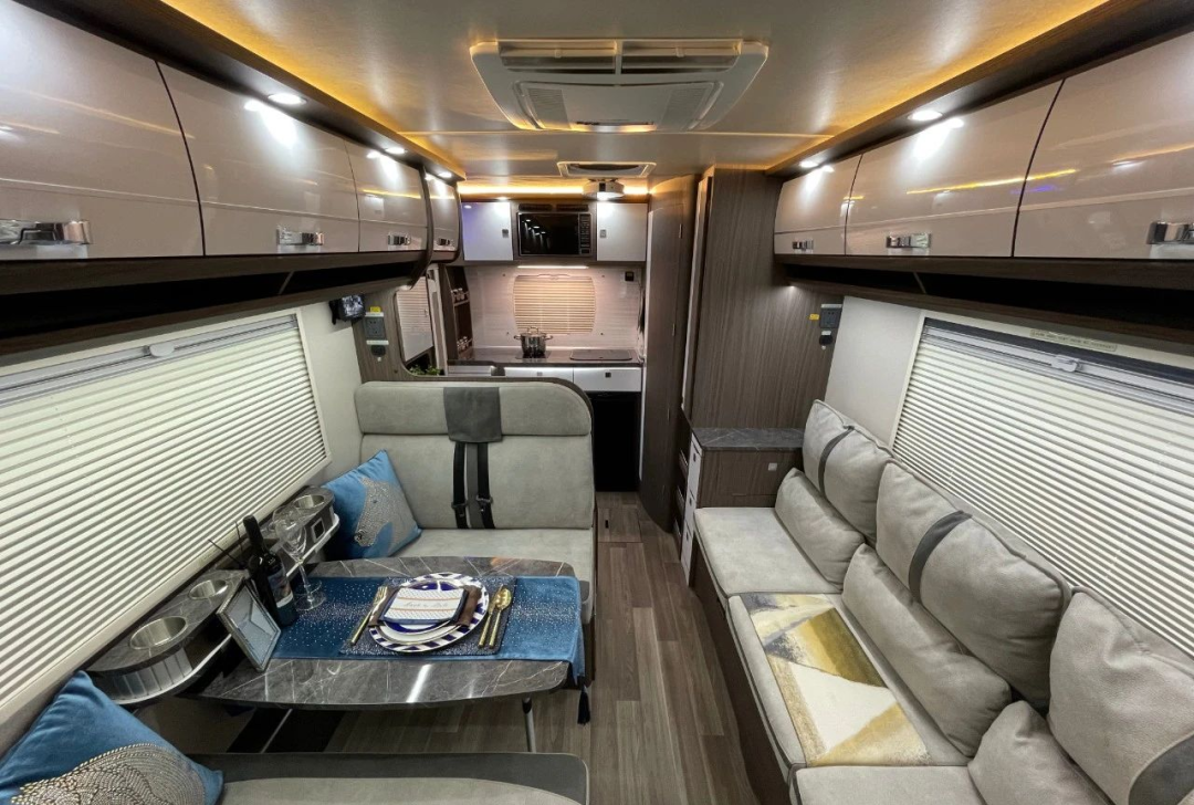 ● 后侧开门设计,更大地释放了车内前部分的空间,使休息区域与活动区域有了更明显区分。同时配备了一套152L可双冷藏冷冻的英得尔冰箱,美的微波炉,带盖水盆和嵌入式电磁炉, 还有超大储藏空间的储物柜;