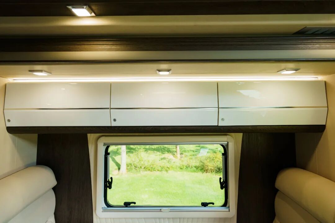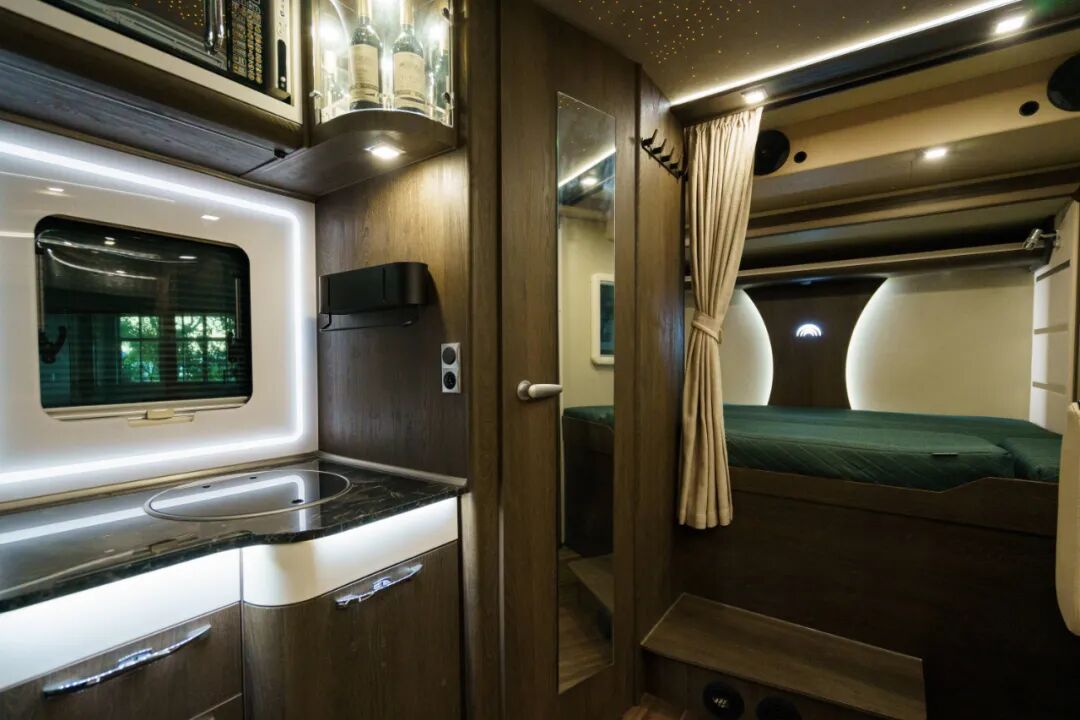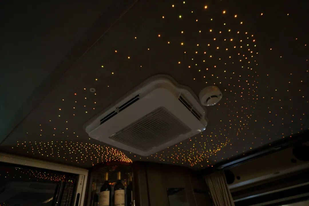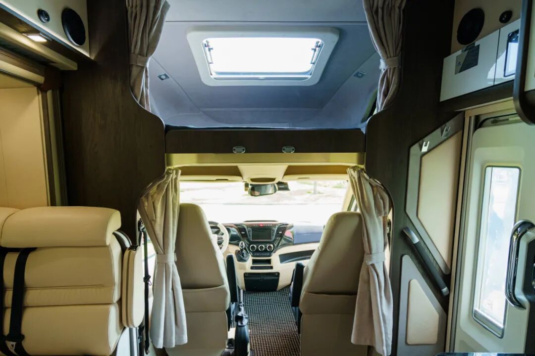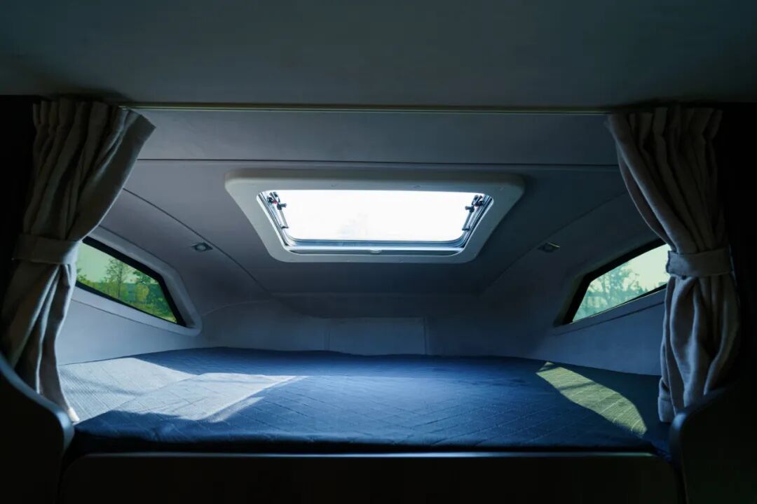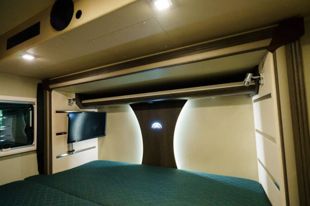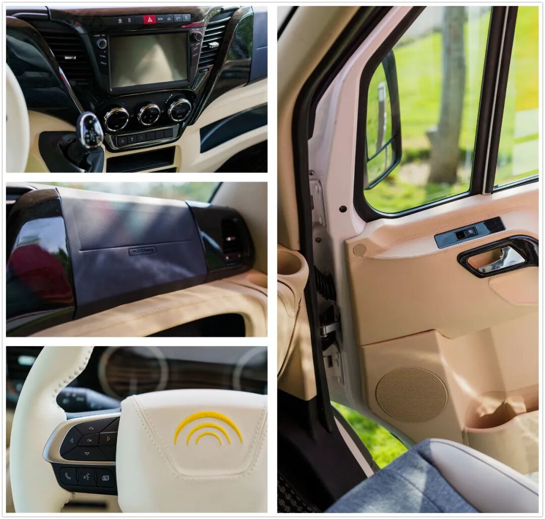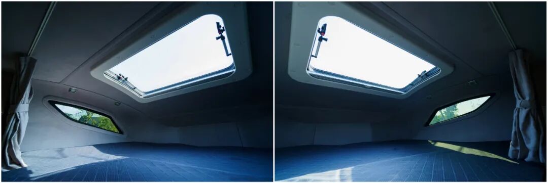 顶部设有大尺寸天窗,左右设有侧窗,内部采光通风有保障;侧窗采用电控隐私玻璃膜替代传统窗帘,遥控器控制,便利性强;此外,额头床顶部还隐藏一台32英寸的电视,搭配乘客区的四个进口扬声器,打造全方位的视听娱乐体验;