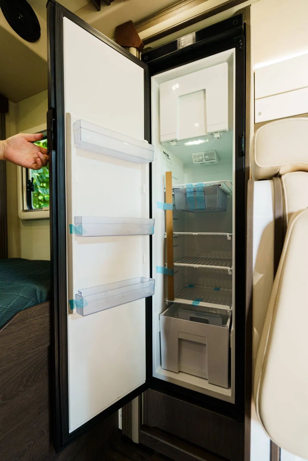与厨房区搭配的还有一台152L赛特福德冰箱,位于会客区后方,超大容量,满足长途旅行时储存食材的需求;