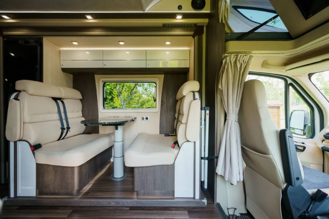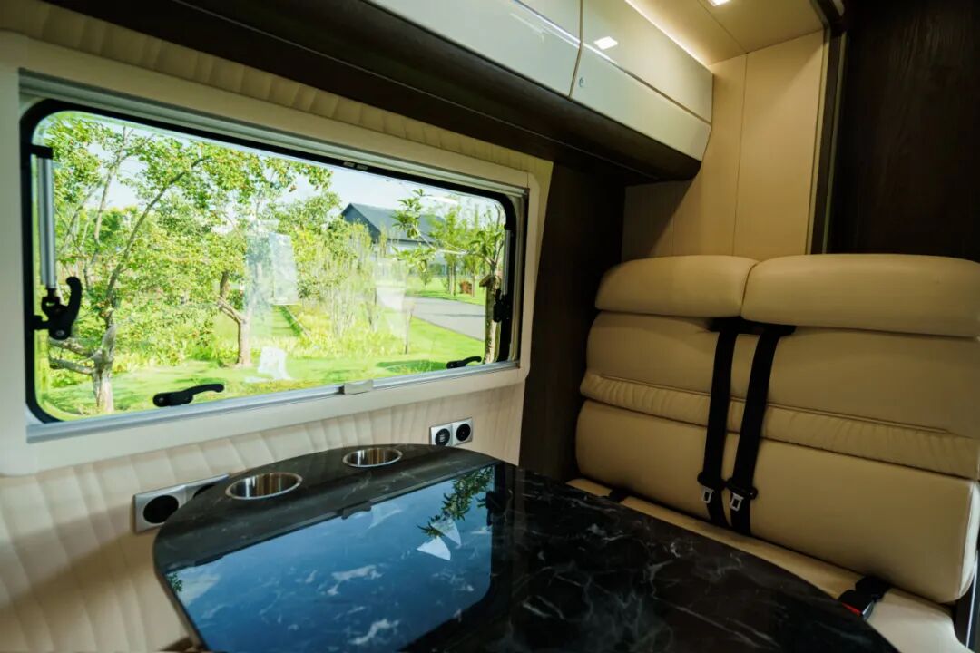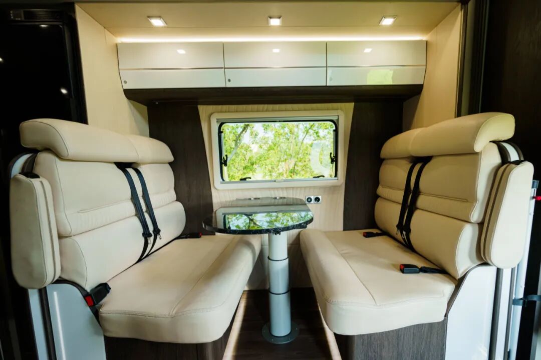 会客区新造型对坐卡座采用皮革包覆,配有可调节扶手,宽面头枕,日常乘坐起来更加舒适,同时卡座带有多个安全带方便行车时坐人;