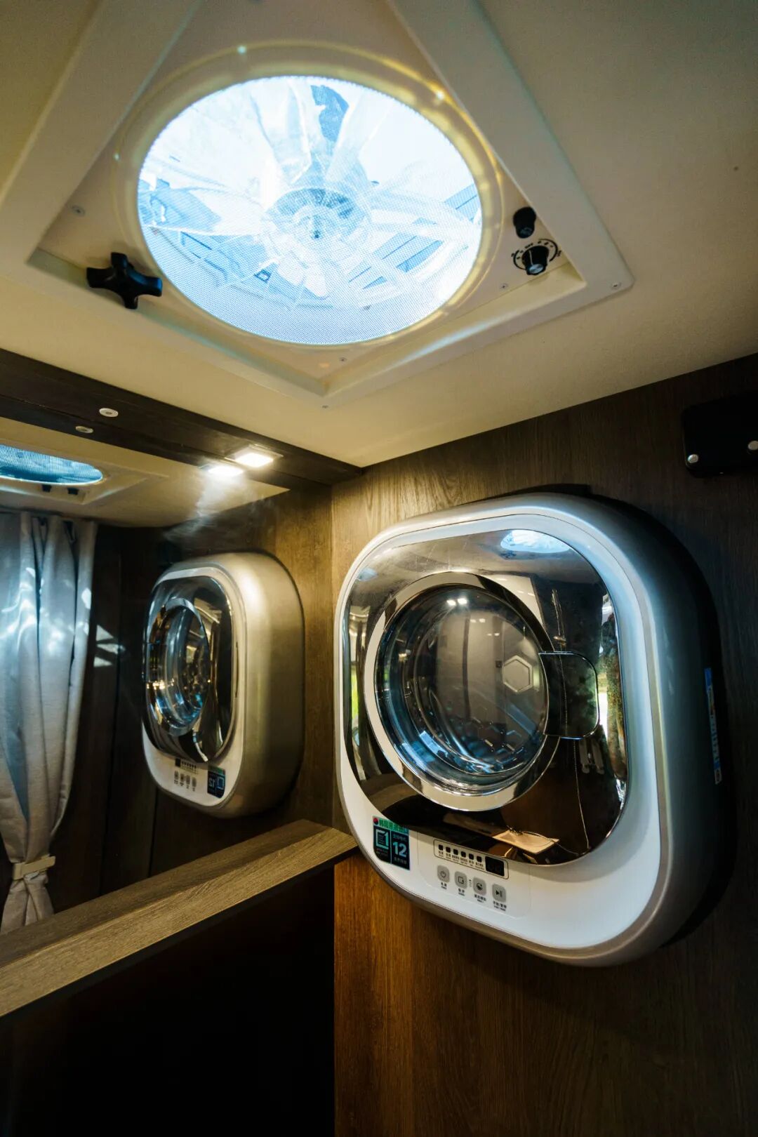 卫浴间上方内嵌一台洗衣机,方便日常清洗小件衣物;顶部换气扇,内部空气循环进一步加强;