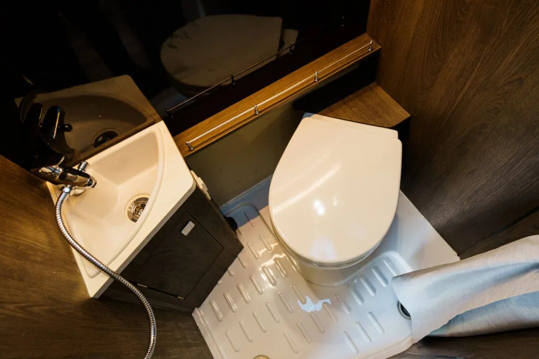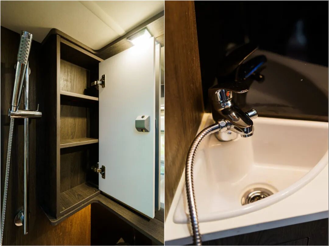 内部配置了电动粉碎马桶(40L黑水箱+电动/手动排污阀)、洗漱池、独立淋浴花洒、分区壁柜+开放式储物格、毛巾架、隐藏式晾衣绳、挂衣钩、暖风出风口等设施,充分满足车上人员卫浴洗漱的需求;