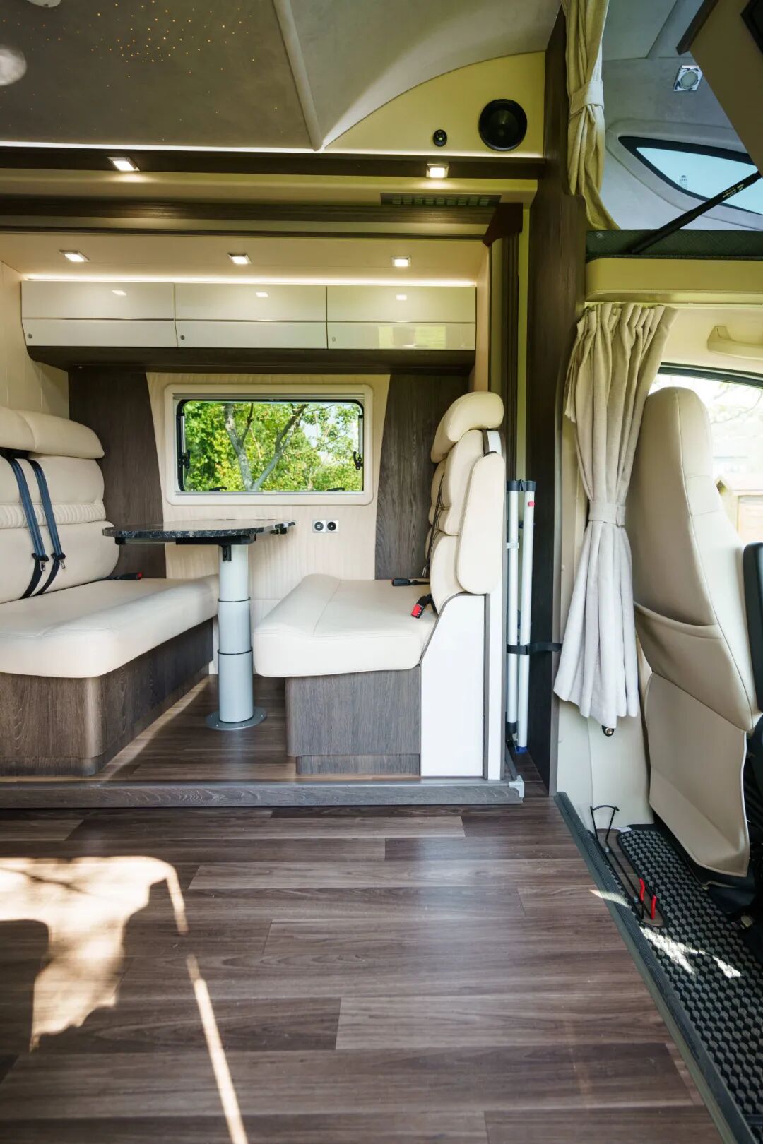 驾驶舱与后方生活区采用贯通式设计,方便日常进出;生活区内饰部分选用进口烟熏橡木板材+条形纹理皮革软装,不露墙,旅居舒适度进一步提升;