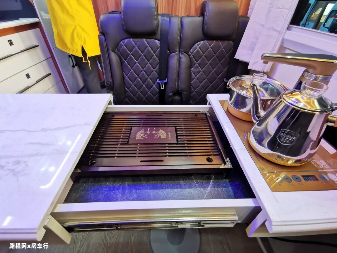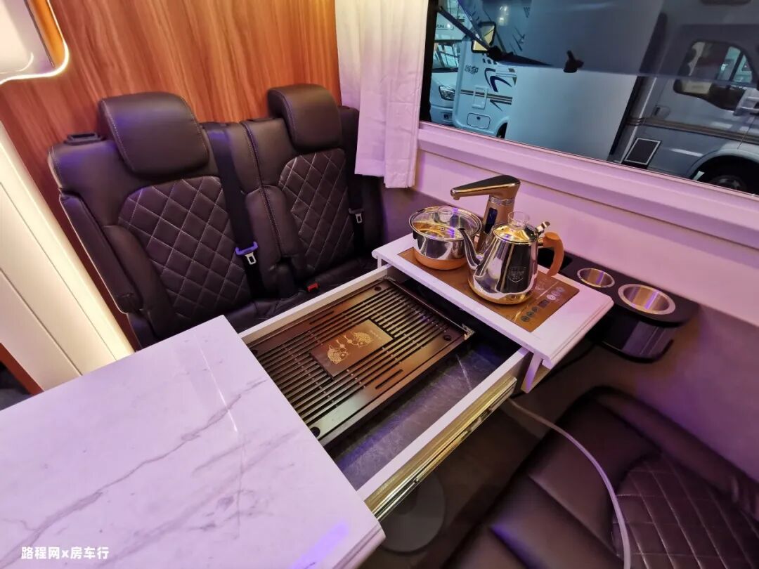 中间的升降餐桌看似简单实则是一张茶道桌,对于饮茶爱好者来说是一大亮点,出门旅行也能享受惬意放松的饮茶时光。