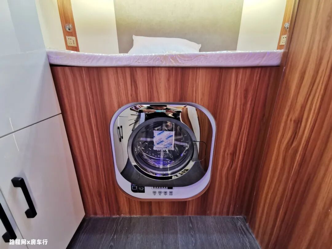 尾部横床也是能睡下两人的,床铺周边配备充电口、夜灯和储物空间。床铺下方是mini滚筒洗衣机,轻便的衣服可以放心交给它。
