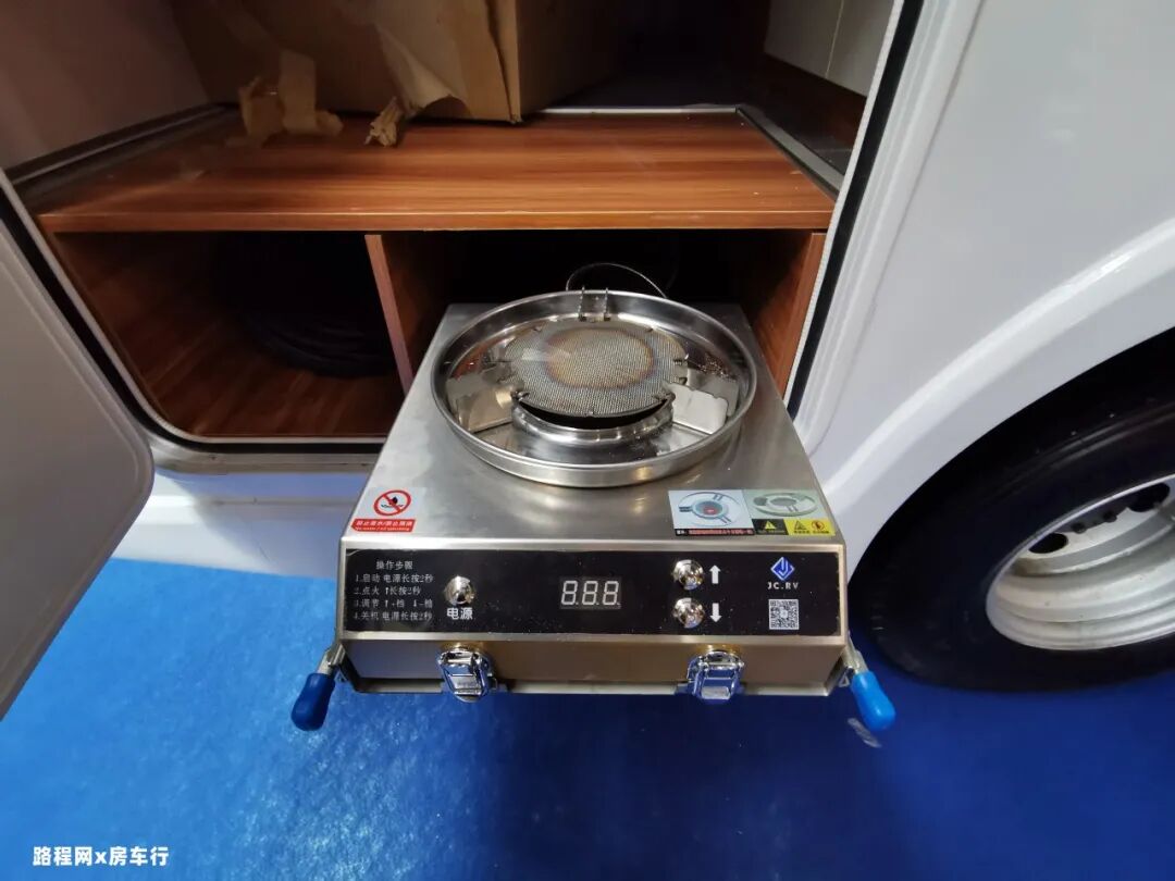 右侧部分功能丰富,上车踏步、上车扶手、遮阳棚、储物舱等设施一应俱全,外置抽拉炉灶配置在靠近车尾的部分,户外做饭更适合房车旅行。