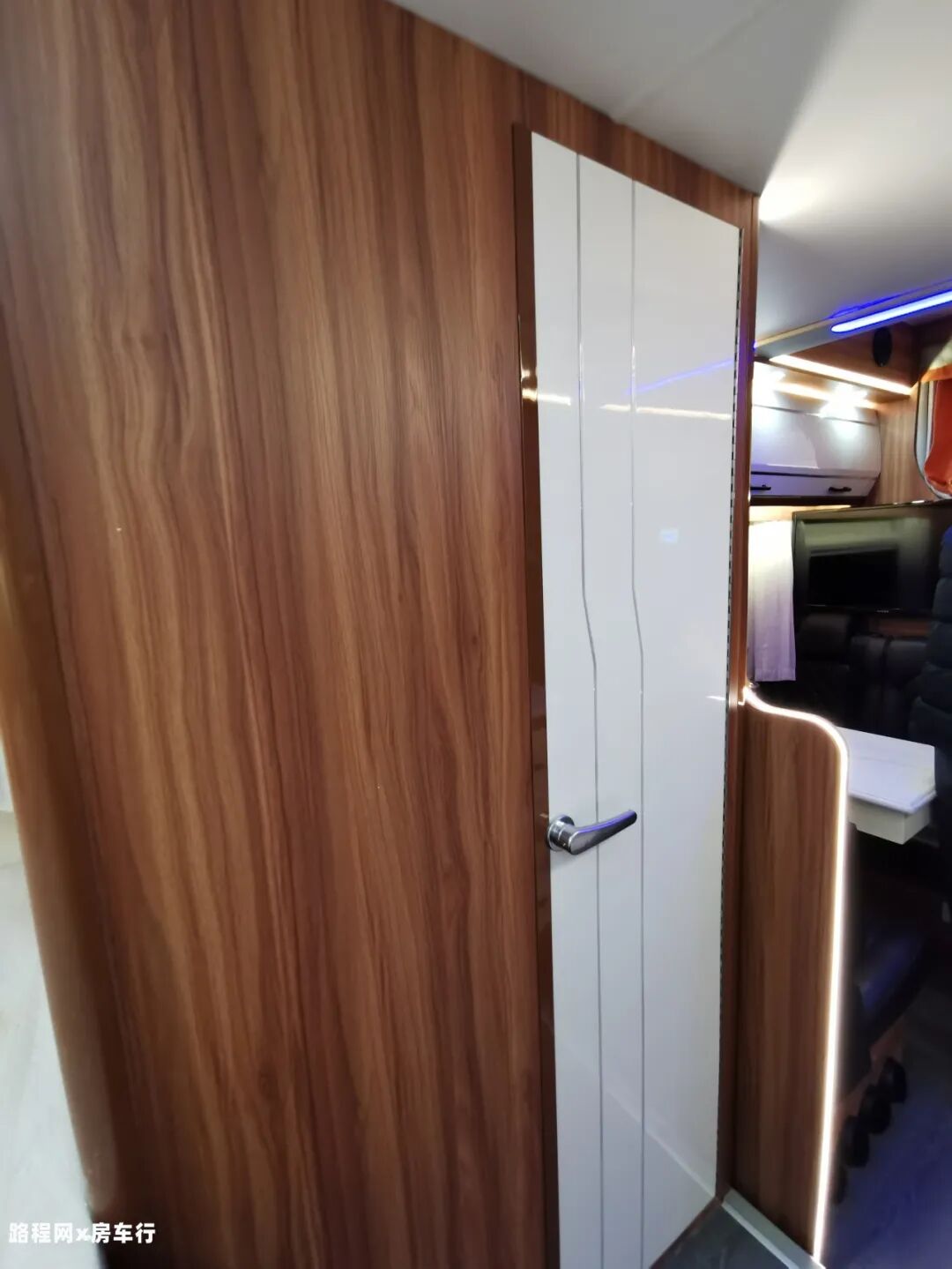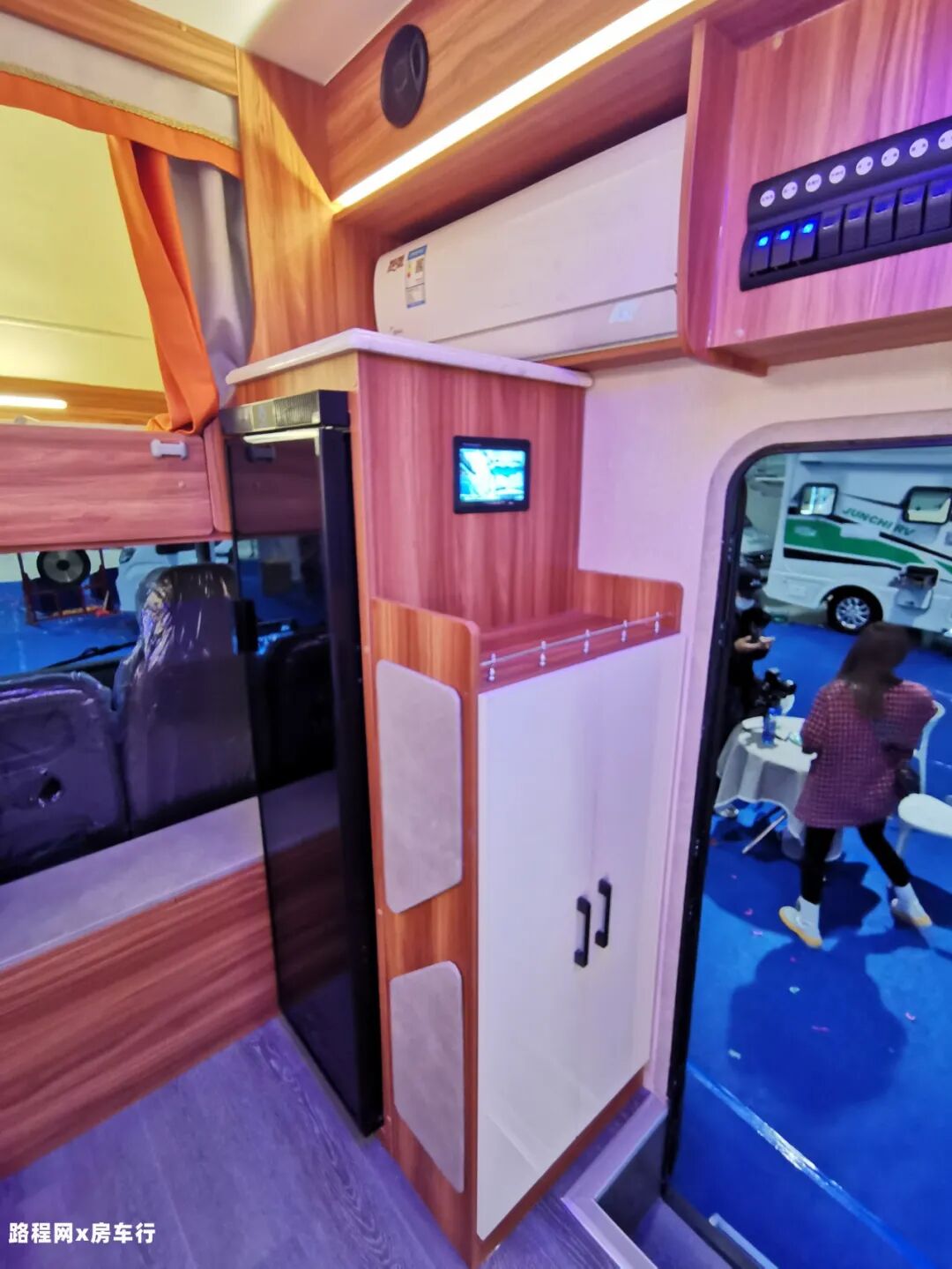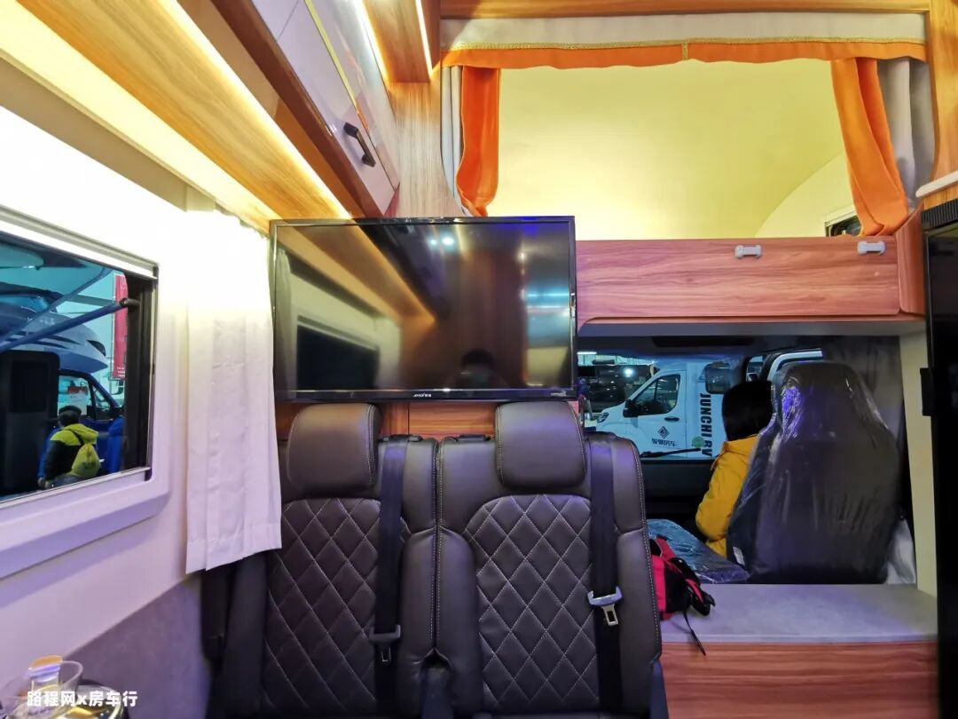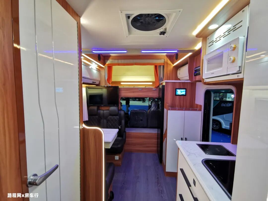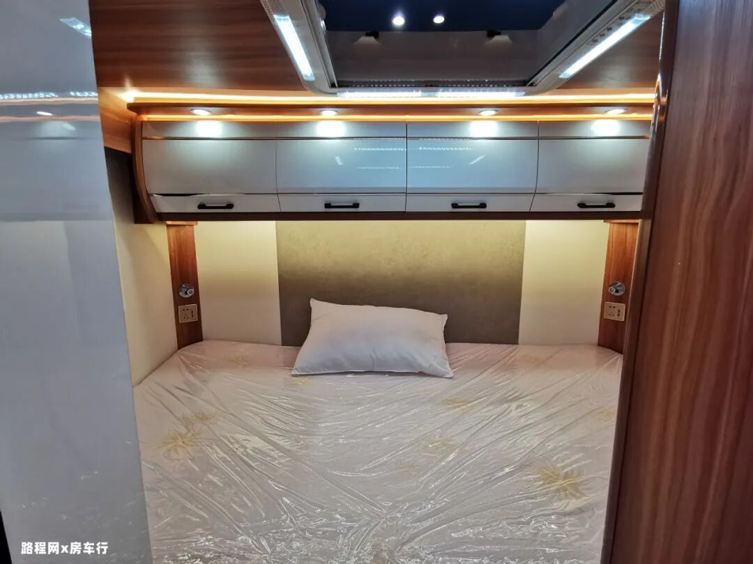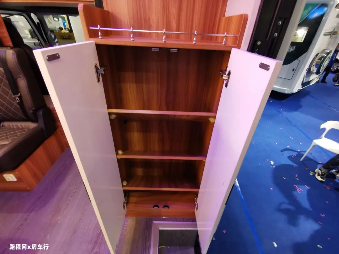 再往旁边看,是房车的150L车载冰箱,容量充足;家用式变频空调制冷制热均可,更省电更静音。