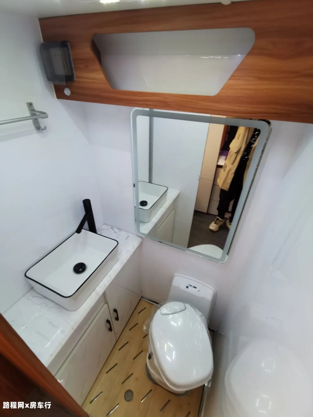 一体式的卫生间内部配置了盒式马桶、卫浴镜、双向电动换气扇、储物格、置物架和洗漱盆,日常洗浴是可满足的。