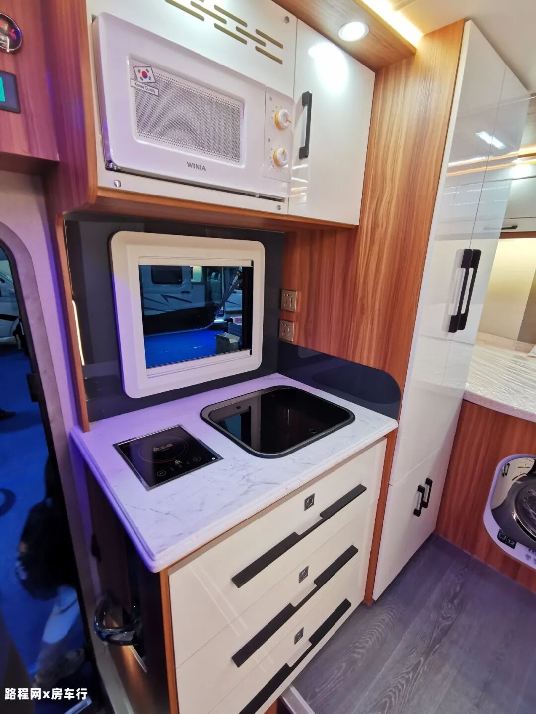 车门左侧是房车的厨房区,电磁炉、盖板洗菜池、微波炉、抽拉式储物抽屉等设施均有,虽然室内做饭不太方便,但日常简餐是没有问题的。
