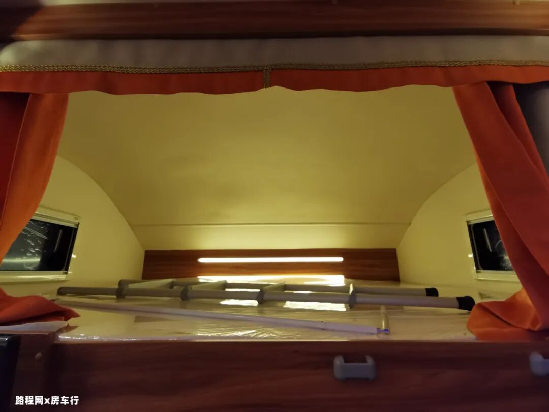 驾驶室上方是额头床,相比于其它的C型房车来说,平头设计使其空间感更佳,对立式车窗可加强空气流通。