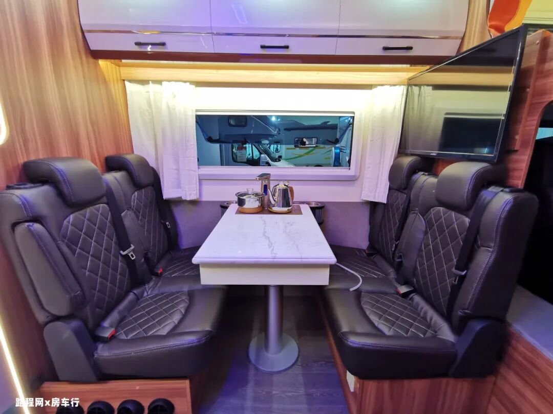 车厢中部是会客区和厨房区,会客区可选择L型沙发卡座,也可选择四人对坐式卡座。四人卡座的座椅均为汽车座椅,座椅外侧配有扶手,乘坐更舒心。
