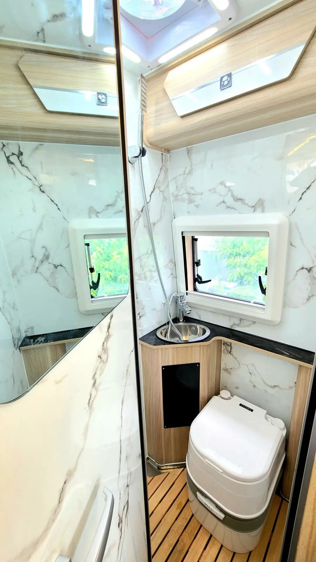 独立卫生间位于车辆中部,配备房车专用便携式马桶、梳妆镜、毛巾杆、淋浴花洒、顶置换气扇等实用设施。120L的净水箱+50L的灰水箱,能满足日常生活的洗漱需求,让房车生活更加舒适。