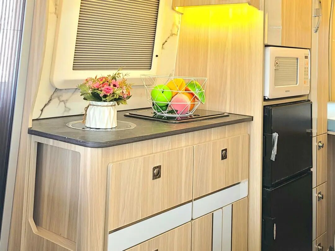 俗话说,麻雀虽小五脏俱全!厨房区域的设施非常齐全,翻盖水槽+可折叠水龙头、嵌入式电磁炉、85L房车专用冰箱以及微波炉,完全可以满足出行在外的日常需求。