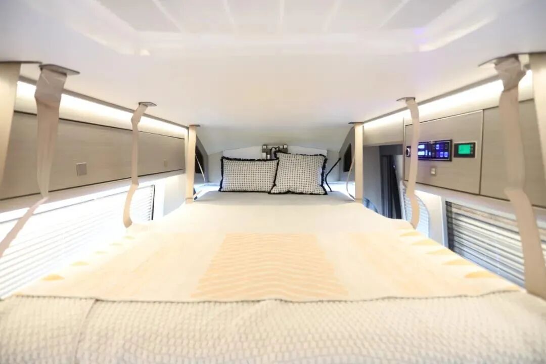 另一个休息区位于会客区顶部,设有电动升降床,驻车时放下,睡眠空间进一步增加;同时支持选装前置双人升降床;
