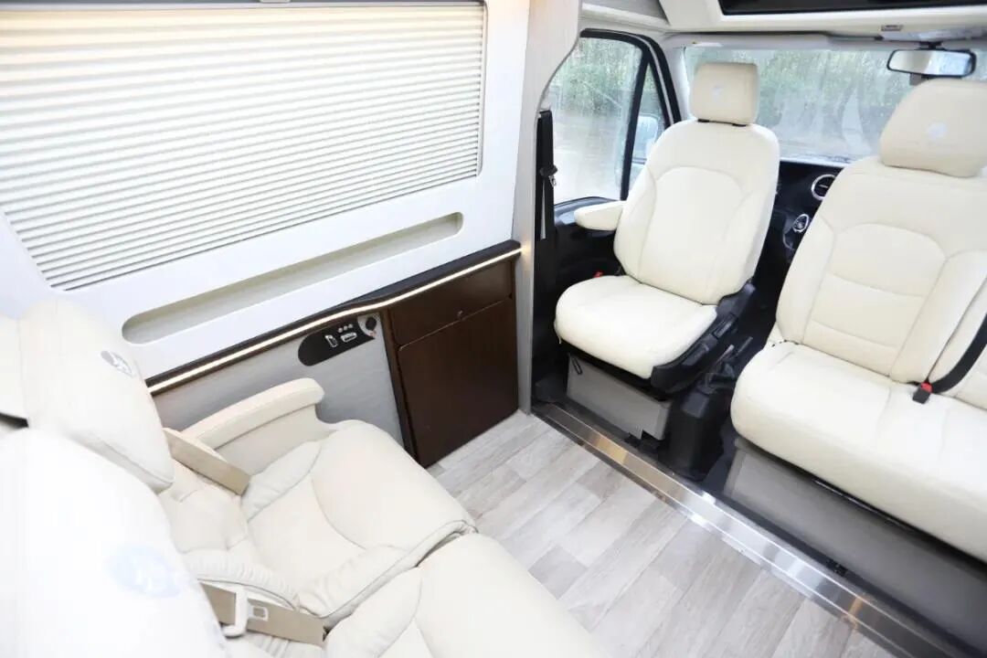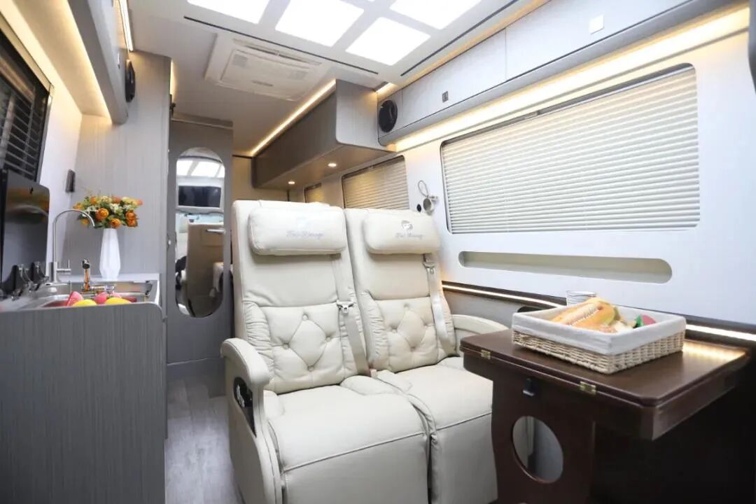 会客区采用航空级双人座椅,乘坐舒适度有保障,并配有安全带方便行车时载人;座椅前方设有一键式多功能餐桌;侧方配有充电插座方便日常给手机充电;充电插座上方设有小型置物格可用于放置一些小件物品;侧方大尺寸外推窗,顶部储物吊柜;