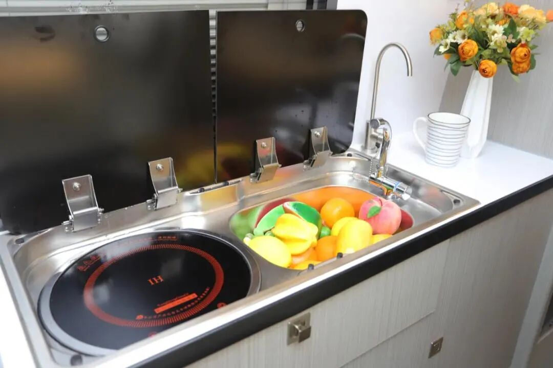 厨房区与会客区相邻,一体式橱柜设计,内部配备带盖板的电磁炉+专用水池+折叠式水龙头、净水龙头、抽屉、储物柜等设施;与厨房区搭配使用的还有一台房车专用12V冰箱、大宇微波炉,满足车内烹饪的各项所需;