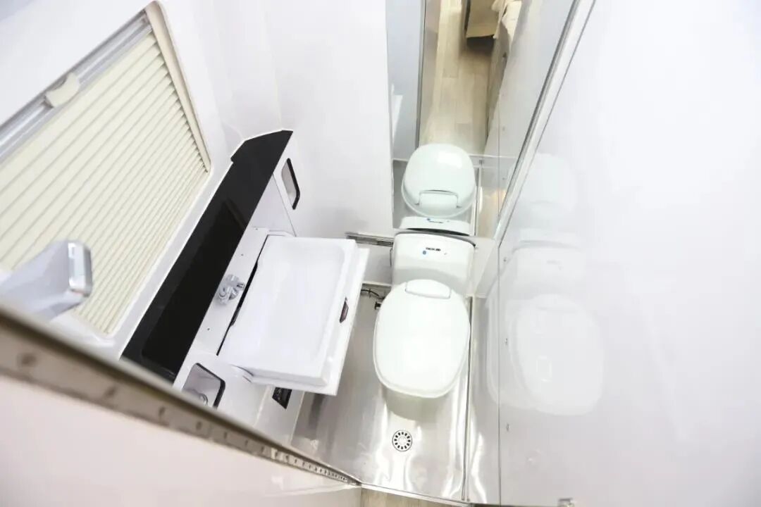 作为一款B型房车,新车在车内空间有限的情况下依旧规划了独立卫浴间,内部空间并不算很大,却也足以满足一名成年人日常卫浴洗漱的需求;洗漱池采用折叠隐藏式设计,不需要使用可折起节省空间,空间利用率进一步提升;此外,卫浴间内部还配备了赛特福德抽拉马桶、独立淋浴花洒、毛巾架、浴镜、置物架、排风扇、外推窗等设施;