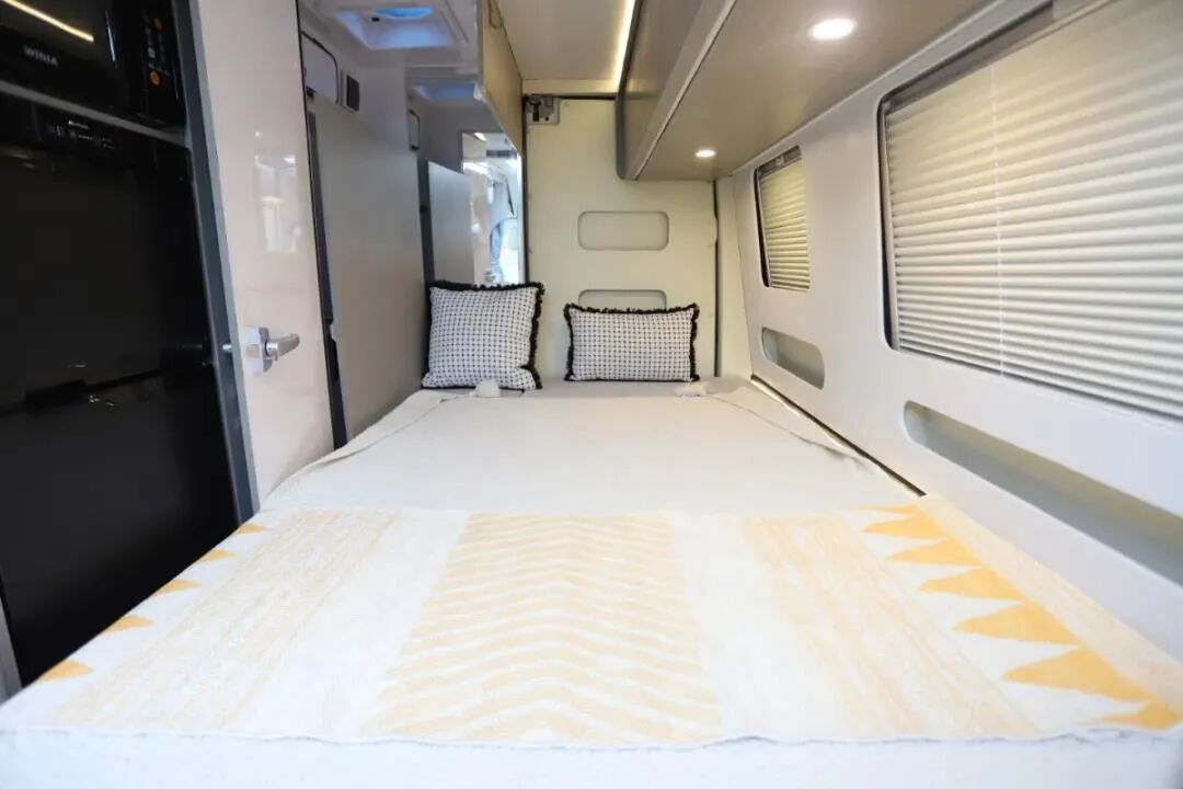 固定休息区位于尾部,采用纵置床的设计,固定床可拓展并带有储物功能,内部空间充足,足以容纳多人睡眠;而与休息区搭配的还有房车专用大衣柜、阅读灯、充电插座、置物格、储物吊柜等;侧方大尺寸外推窗,日常采光、通风有保障;