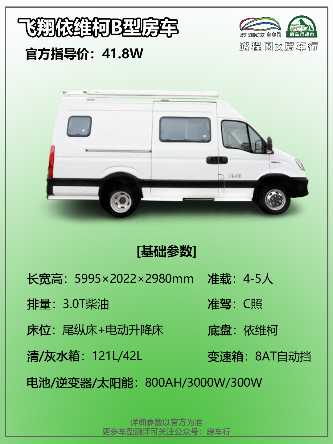 飞翔新款依维柯B型房车的车身外尺寸为5995x2022x2980mm,轴距3300mm,总质量4.49T,核载4-5人,满足上蓝牌、C照可驾驶的要求;外观方面新车以白色漆面打底,下方浓郁的黑色贯穿首尾,保持了原有车身的简洁,简单不失大气,美观的同时也更加耐看;