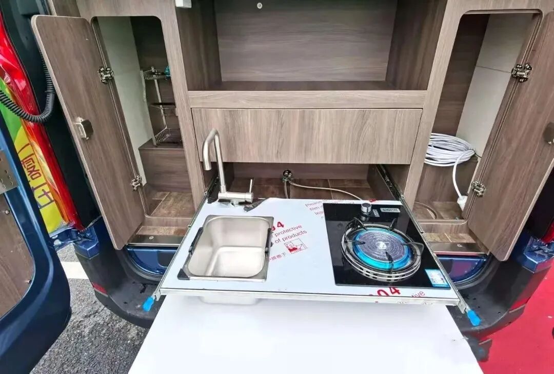 这款房车还有一大特点就是房车尾部为户外抽拉式厨房,配有燃气灶、洗菜池、折叠式水龙头、储物柜、拓展面板等。整个操作空间大大提升,同时也免去了车内烹饪的各种烦恼。