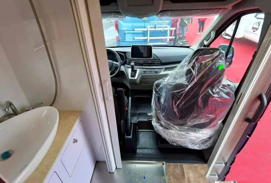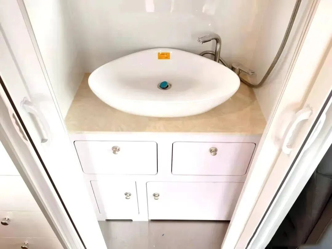上车门正对面不再是会客区而是一个开放式的洗漱台,采用卷帘门设计,可形成独立的卫浴空间,有效节约了房车内部空间。内置淋浴花洒、置物柜、梳妆镜、外推窗等,设计很独特。