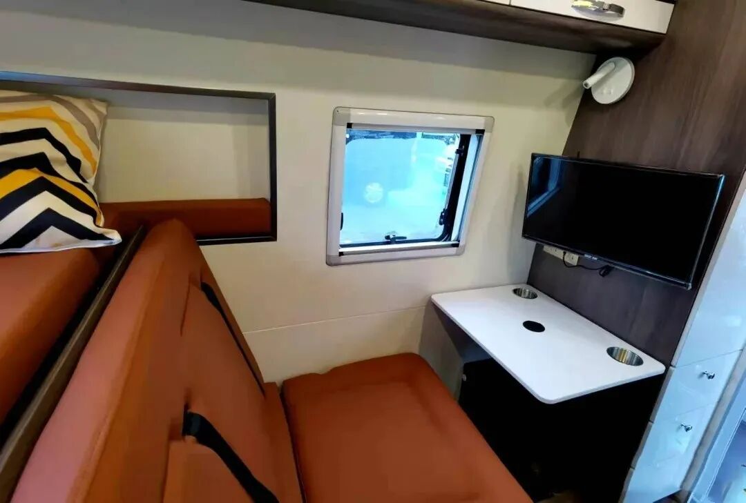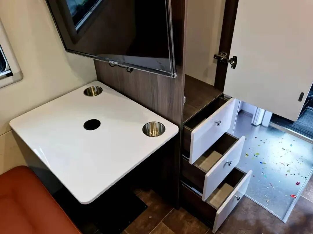 紧挨着卫浴区的是会客区,配有单排三人座椅以及一张升降式小餐桌,桌面设有杯槽,可防止水杯等在行车途中因晃动而掉落。在餐桌上方还配有一台27寸的网络电视,观影比较方便。