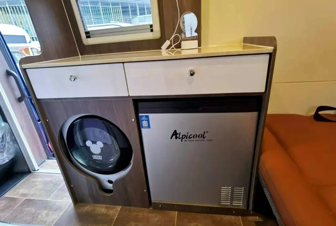 在上车门左侧是一个小型操作台可当做吧台使用,下方是抽拉式储物柜、2.5公斤的车载滚筒洗衣机以及车载冰柜,基本配置比较完善。
