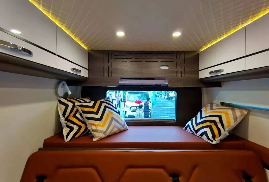 会客区与休息区组合在一起,将座椅靠背向上翻起再用支架支撑住,便可变成上下铺。上铺尺寸为1800*1200mm,下铺尺寸为1800*800mm,满足一家三口的睡卧需求。床铺后方还配有12V驻车空调,冬暖夏凉。