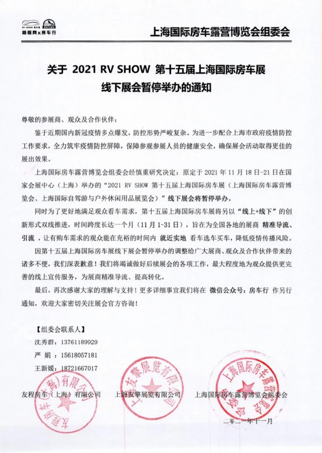 上海国际房车露营博览会组委会经慎重研究决定:原定于2021年11月18日-21日在国家会展中心(上海)举办的“2021 RV SHOW 第十五届上海国际房车展(上海国际房车露营博览会、上海国际自驾游与户外休闲用品展览会)”线下展会将暂停举办。