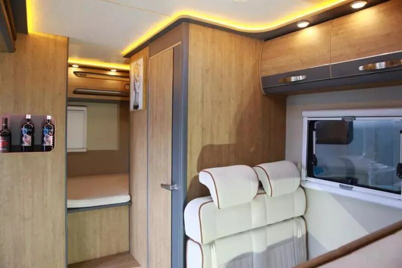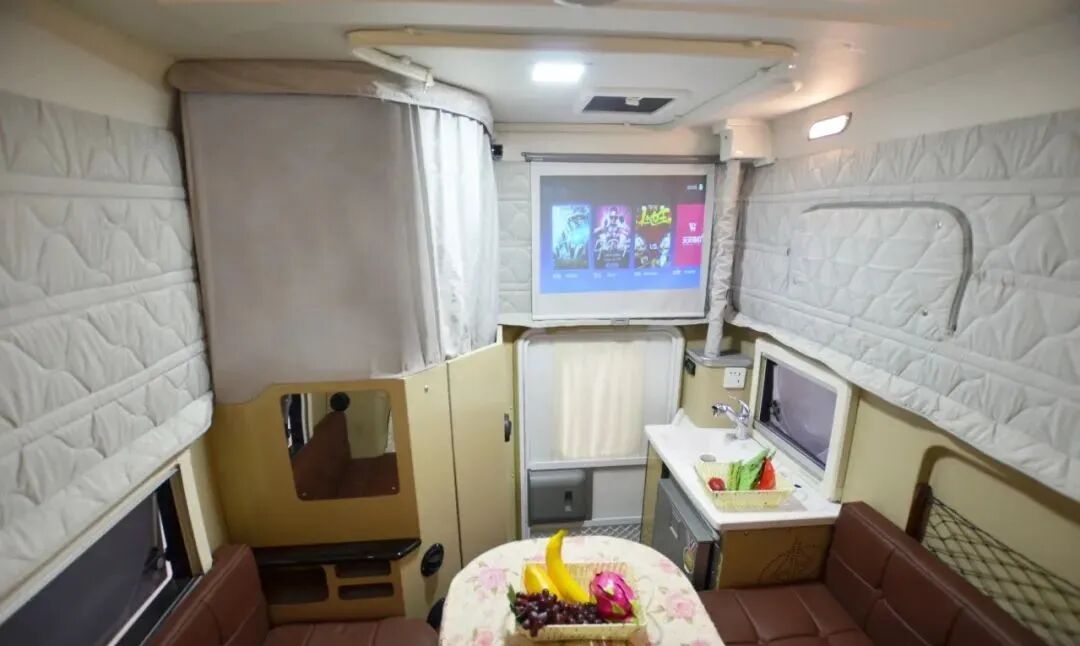 车身配备两张大床:一张大额头床,尺寸为1800*1500(mm),床板,下面配置了一台30寸的液晶电视。会客区由双人位的乘用车座椅沙发和一张桌子组成。尾部横床的设计,尺寸为1920*1100mm,上方吊柜设计有储物空间和家用变频空调。水电配置方面,整车标配3000W逆变器、400W太阳能、400AH蓄电池、150L清水箱、50L灰水箱。