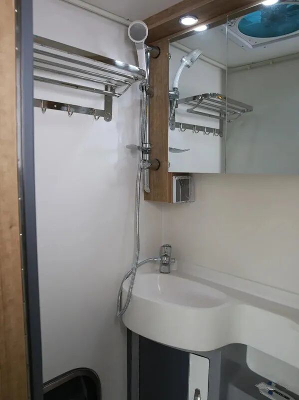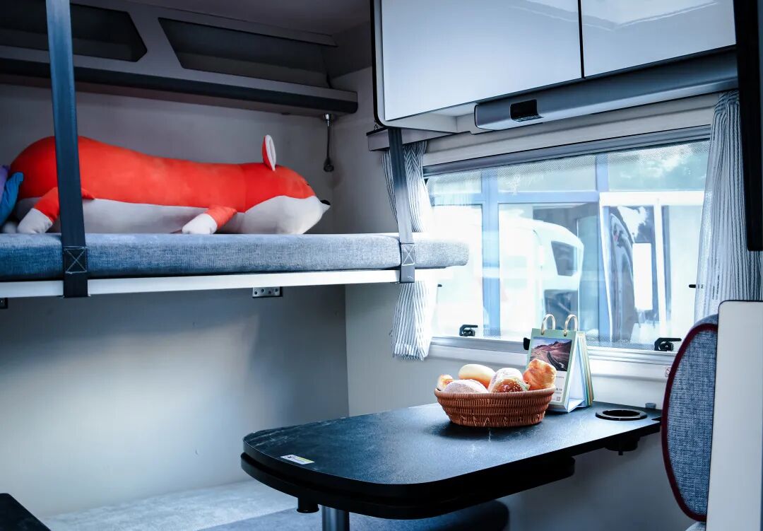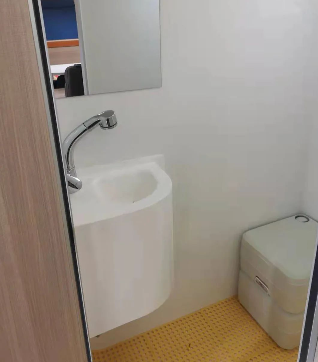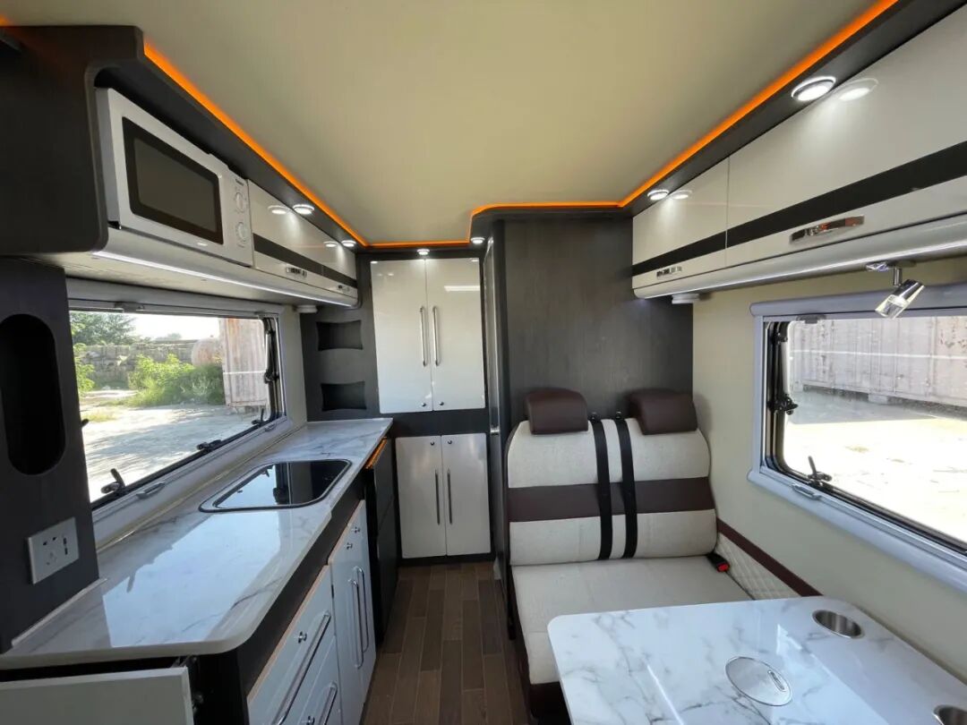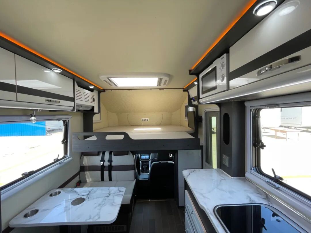 驾驶舱上方是大尺寸额头床,拥有舒适宽松的休憩空间。会客区域,采用经典的四人对坐卡座设计,配有升降桌,座椅靠背支持调节,座椅可组合拼床。额头床和会客区上方设计有大天窗,保障室内采光。厨房区域较为宽裕,家电配置有大容量车载冰箱。配有多功能料理台,带盖洗菜盆,抽油烟机、车载冰箱等。卫生间采用独立式设计,配备便携式马桶、洗手池和淋浴花洒等设施,可满足日常洗漱需求。水电配置方面,整车标配125L净水箱、65L灰水箱。