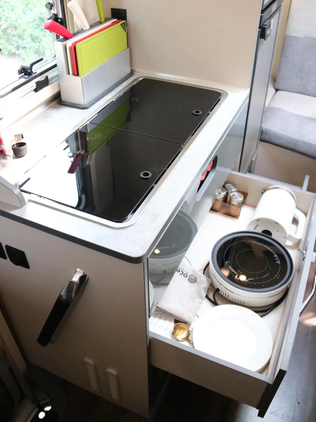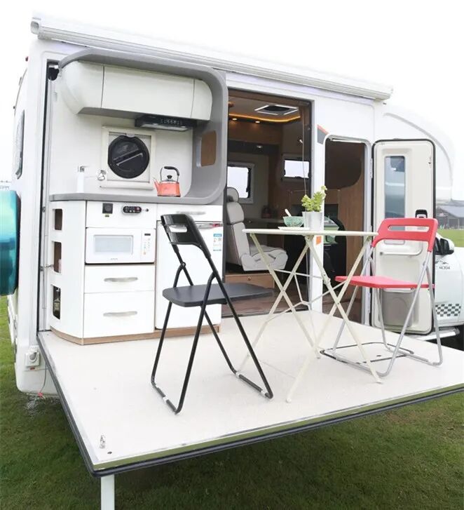 此外,为了增加车内空间,这款车还采用左侧单拓设计,极大地增加了车内生活空间。另一亮点部分,整车采用内外两用厨房设计:在露台展开后,通过电控收放放下房车一侧,再把整个厨房系统翻转至形成的“露台”上方,就可以变成户外厨房使用,避免油烟污染车内环境,未翻转时则作为室内厨房使用。