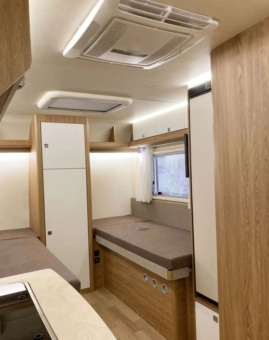 ●拓展后的后双人床尺寸达到了1900×1400mm,车顶的额头双人床2270×1620mm,同时中间的会客区沙发可拼接成床;
