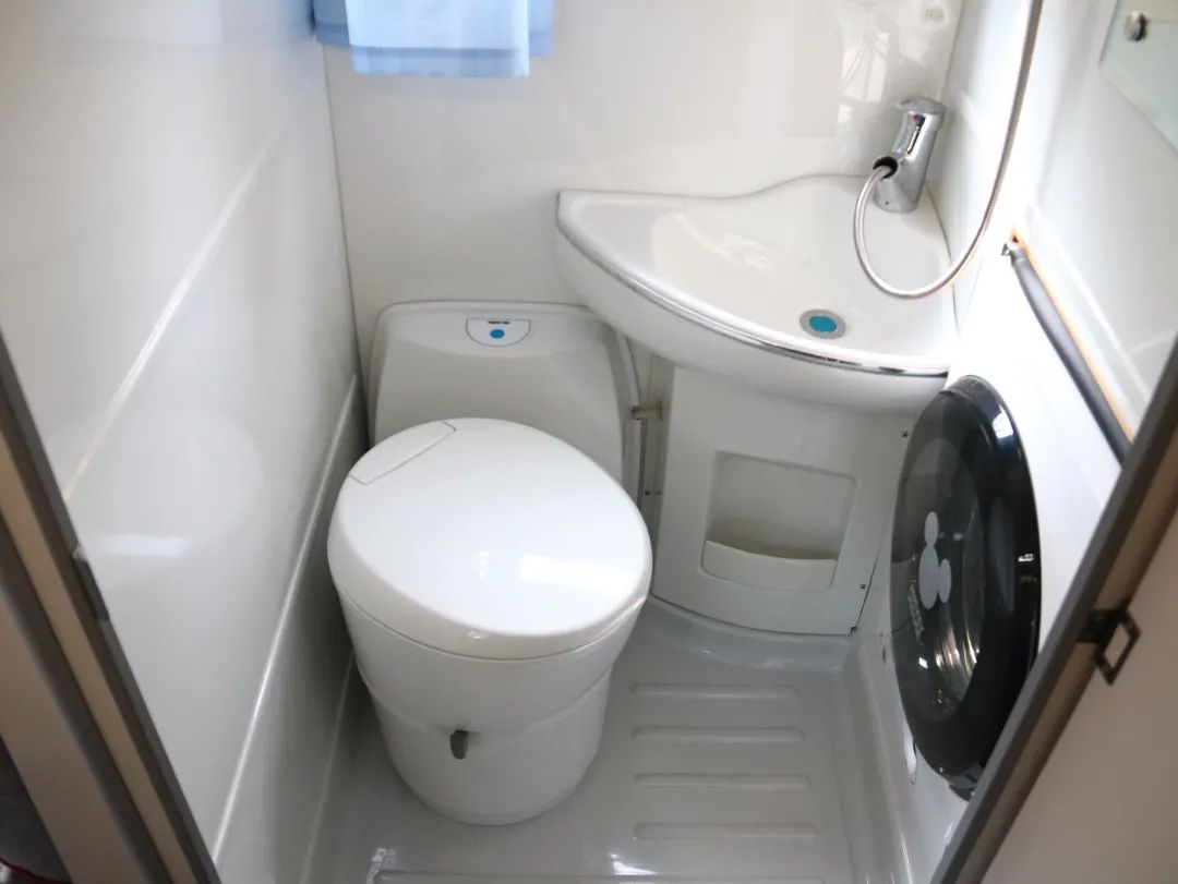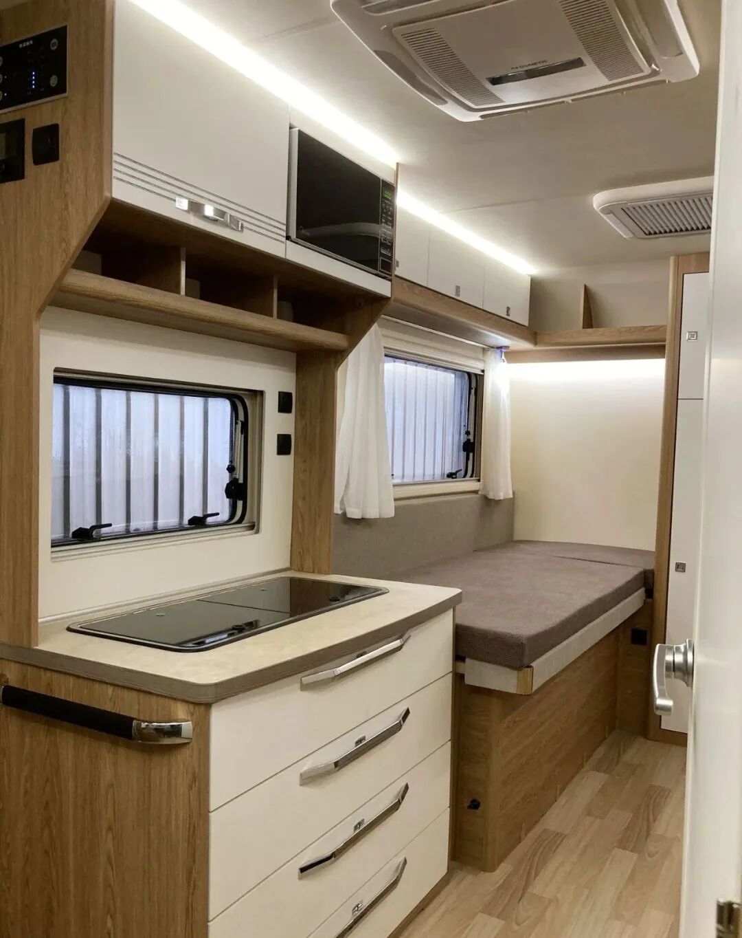 ●厨房区配置了电磁炉、带盖水盆、微波炉、房车专用抽油烟机、滚筒洗衣机、厨具储物柜等设施;
