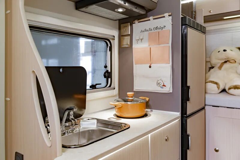 ● 厨房区设有双眼灶/电磁炉、洗菜盆、抽油烟机、英德尔车载冰箱等,轻松解决烹饪难题;