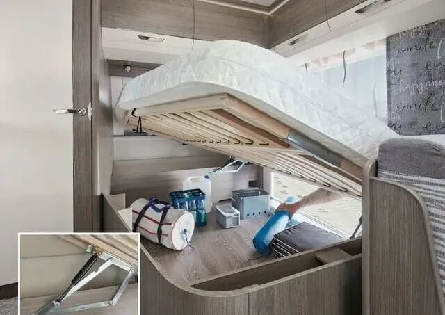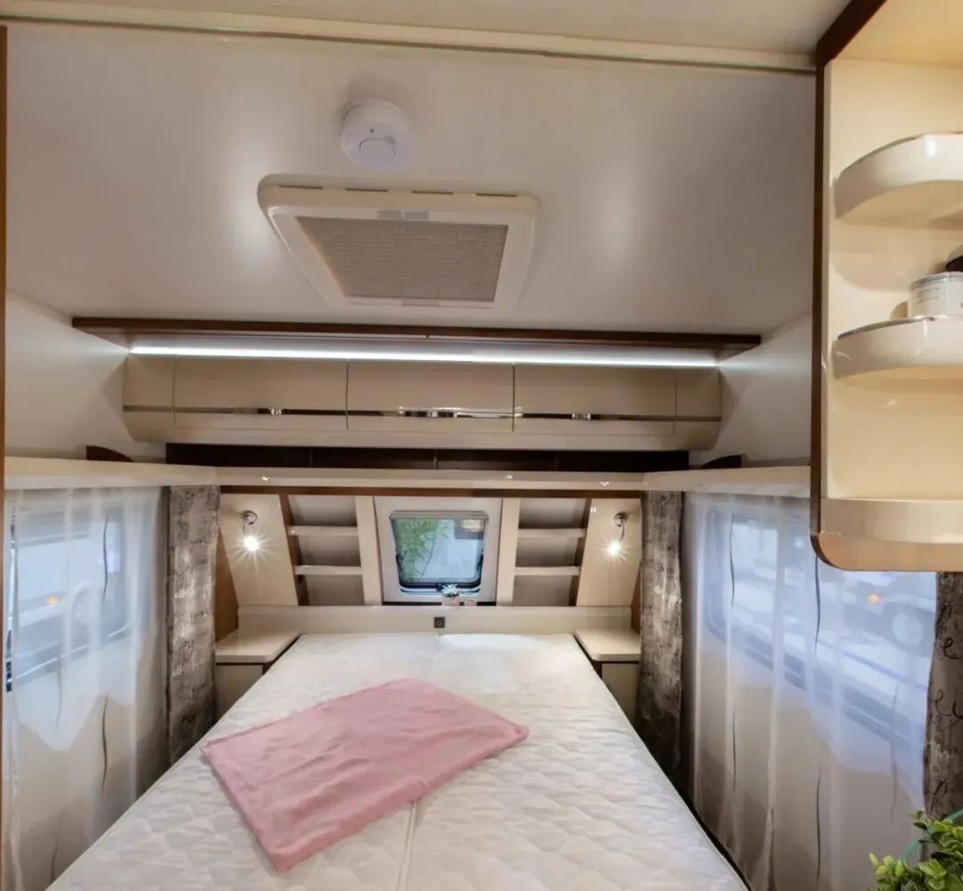 睡卧区配有一张环岛双人大床,尺寸为19010*1460mm,可睡下两名成年人。同时配有高级柔软弹簧床垫,睡卧舒适。两边配有床头柜、阅读灯以及超大车窗配有防蚊纱窗,上方是储物空间,可放出行衣物。