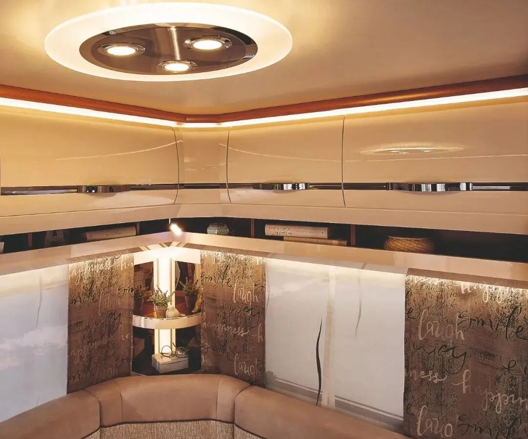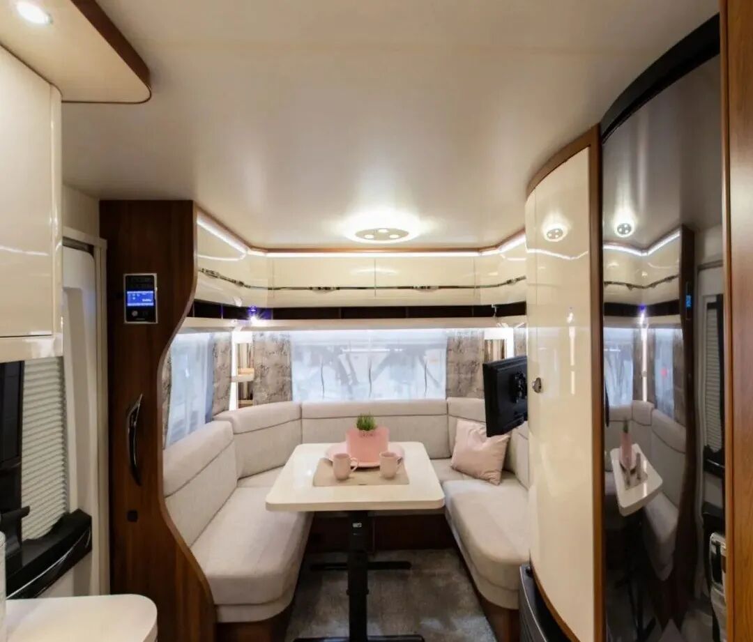 接下来让我们看看房车的内部配置,首先是会客区。会客区采用的是U型沙发搭配升降餐桌的设计。驻车后,沙发可与餐桌拼成一张尺寸为2038*1505mm的双人床,可满足两名成年人的睡卧需求。