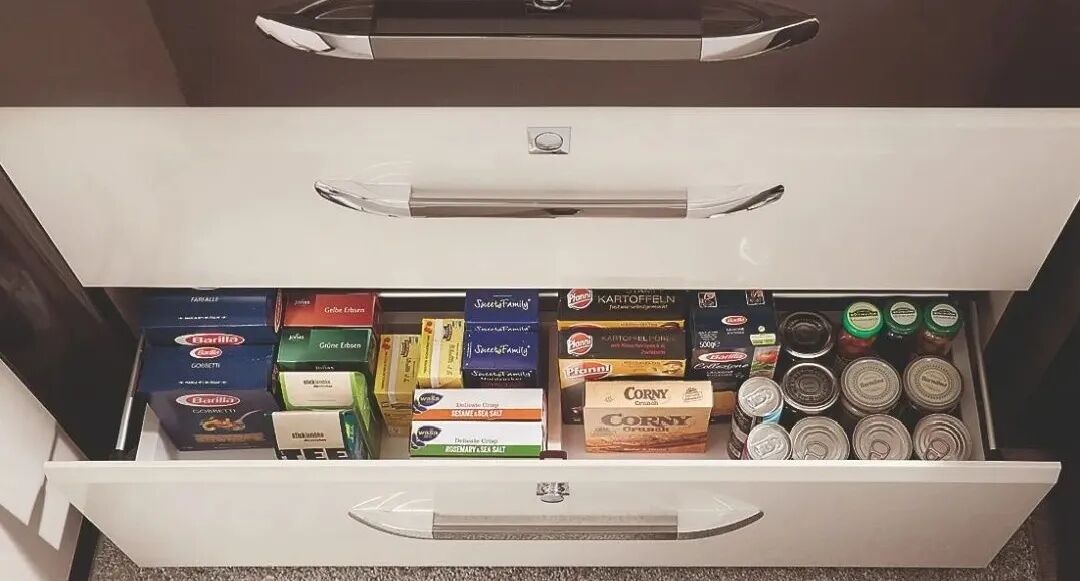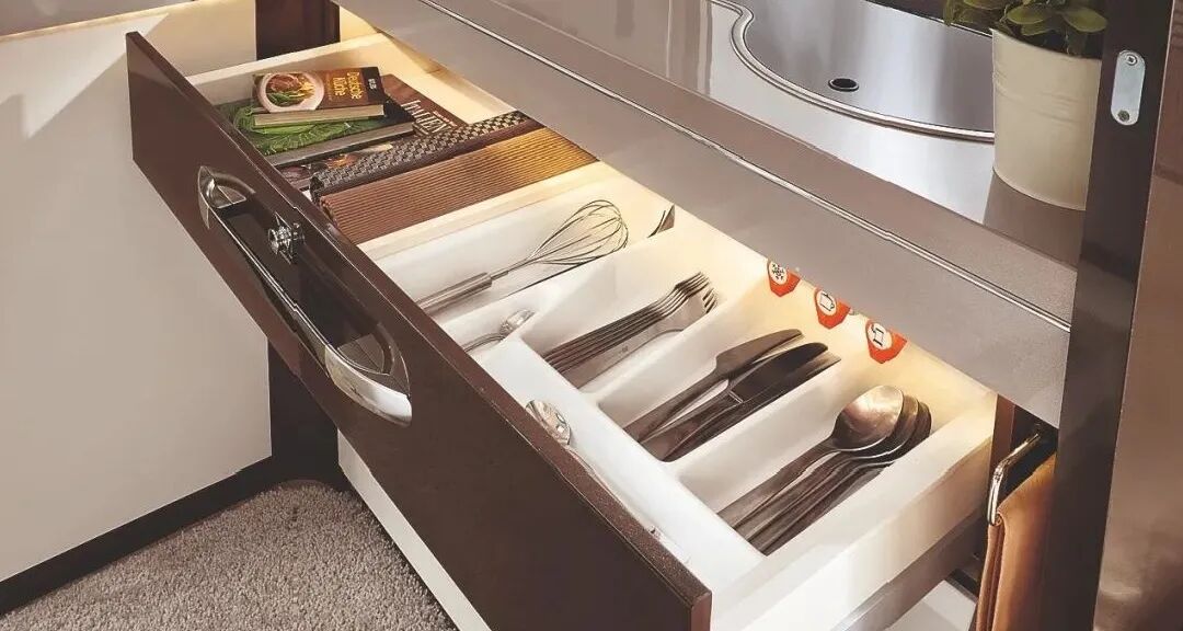 厨房区位于上车门右侧,配有翻盖式水槽、水龙头、电子点火装置、三眼燃气灶、电源插座、照明灯、置物架、外推窗、遮光帘等,操作空间宽敞、配置丰富。上方与下方均配有储物柜,可放置餐具、日常生活用品等。