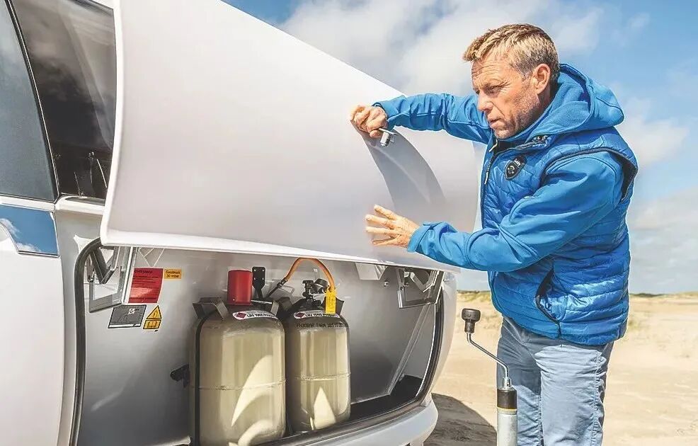 外部还配有一体式高位制动灯、后雾灯、LED遮阳蓬灯、带导雨槽的遮阳蓬导轨等,还配有前舱燃气瓶舱,可满足户外烹饪需求。