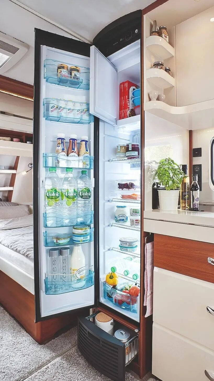 紧挨着厨房区的是一台150L超大微塔式冰箱,同时带有15L可拆式冷冻柜,容量大,长途旅行食材保鲜不成问题。