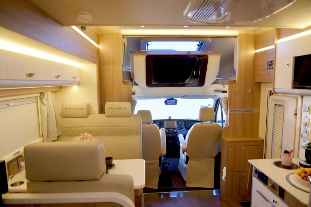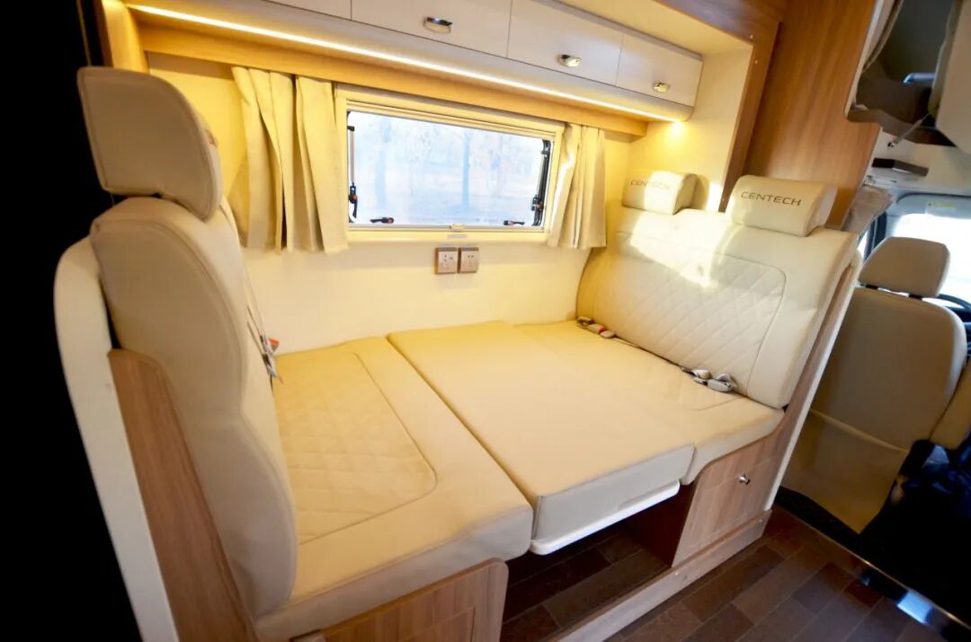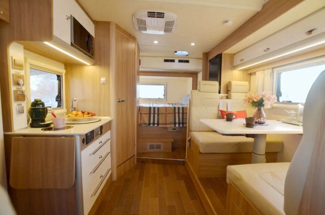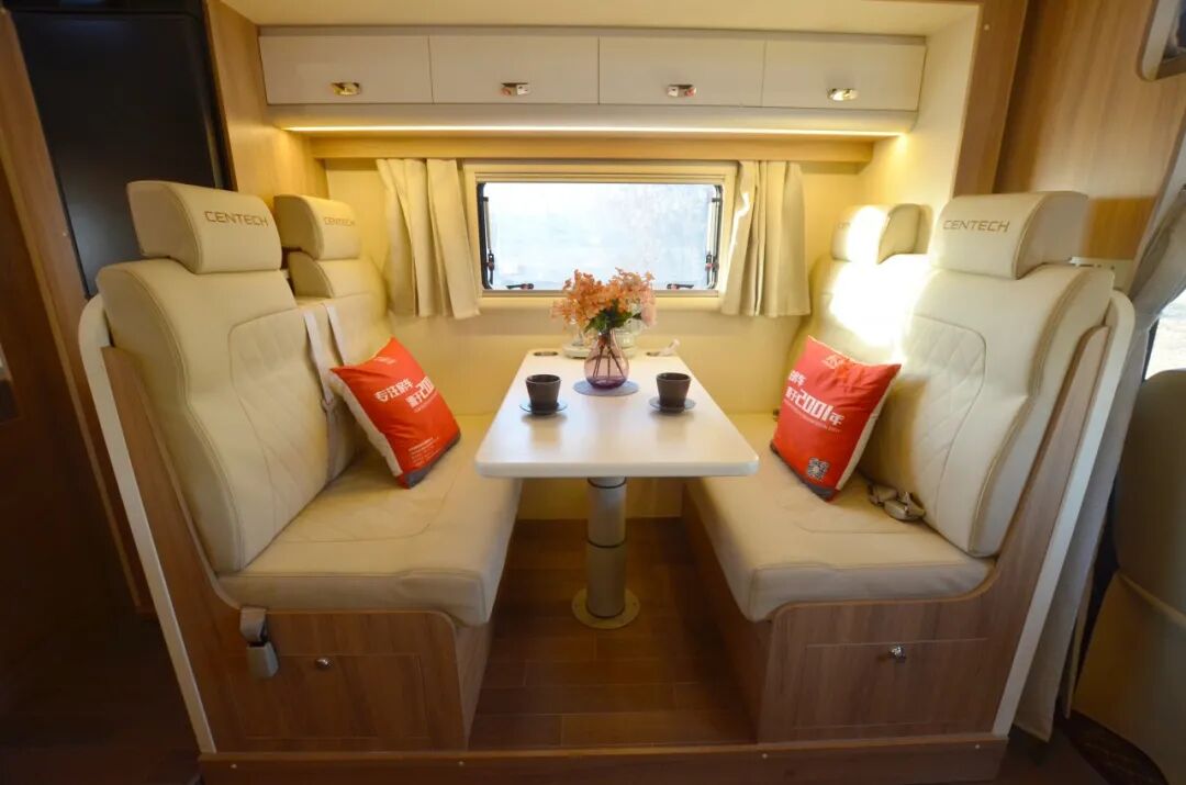 整车内部原木色浅色装饰典雅端庄,E0级环保家具板材居住更安心;从前往后额头床、对坐卡座、厨房区、卫生间、尾部横床的布局经典大方。