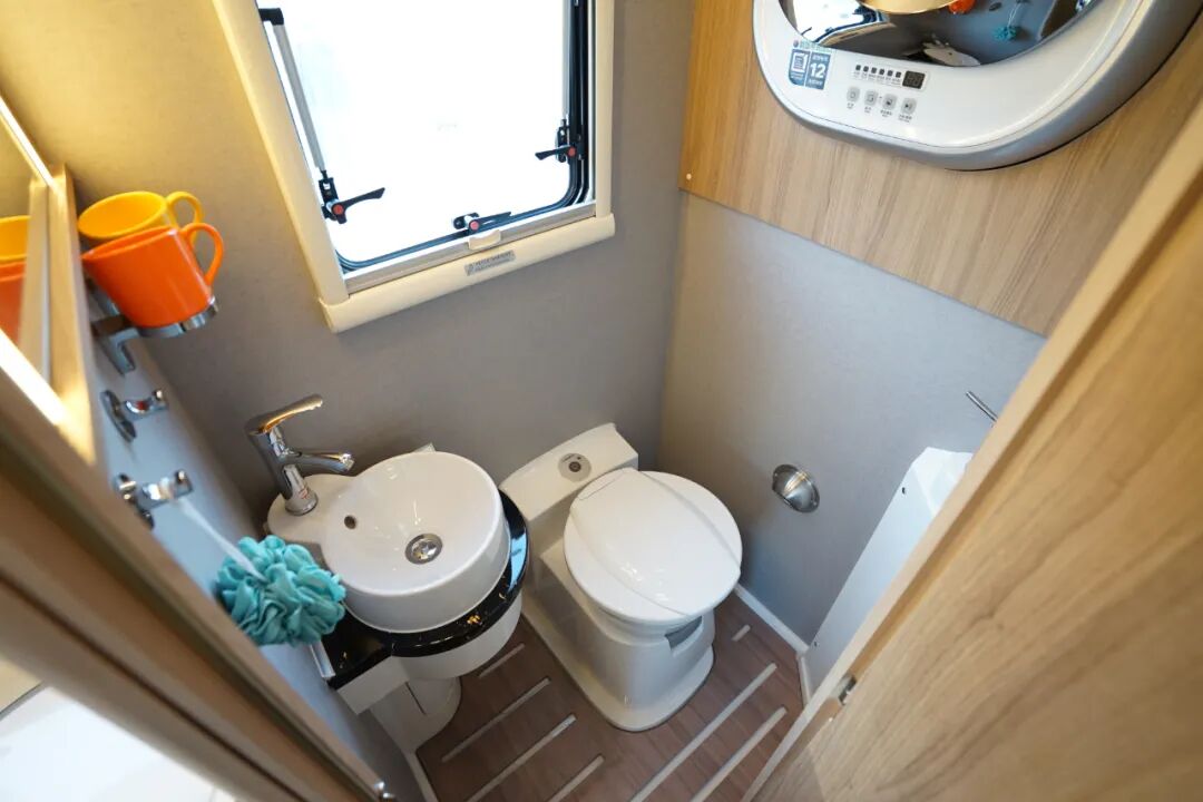 卫生间内部空间尚可,整体配置十分丰富,给人温馨家具的感觉。多美达盒式马桶、洗漱台盆、淋浴花洒、卫浴镜、置物架、隐藏式晾衣绳、换气扇等设施均有,另外卫生间内部还有一台2.5L滚筒洗衣机,轻便的衣物可用它解决。