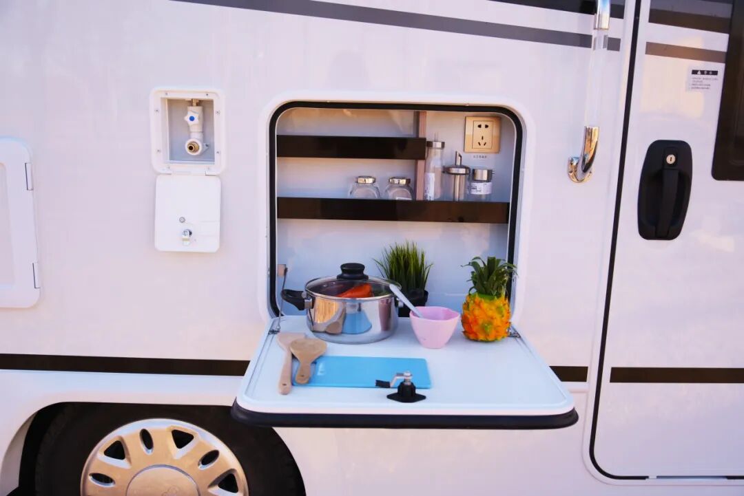 外部功能配置上,由于左侧和尾侧均有拓展机构,因此在车身右侧,整体的功能配置相对集中且丰富。伸缩式电动踏步、外置厨房(带储物格可放置调料、外置220V插座)、外置淋浴、贯通式储物舱、外置遮阳棚等设施均有,车身备胎也能让出行有备无患。