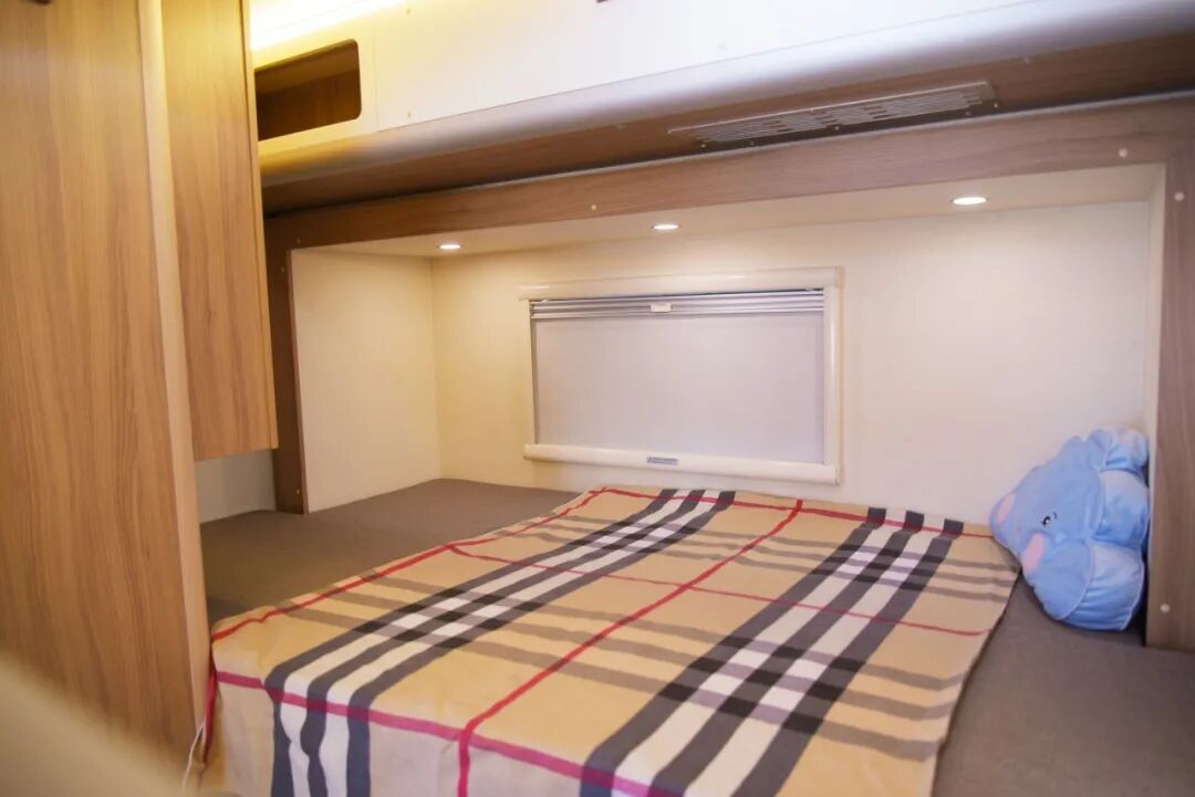 至于睡卧区,该车则是设有额头床和尾部横床等固定。额头床由于梭形额头造型的设计其空间高度并没有那么高,但弧形天窗及对立式车窗的配置是能保证其采光和通风的,在额头床下方还隐藏有32寸网络电视。