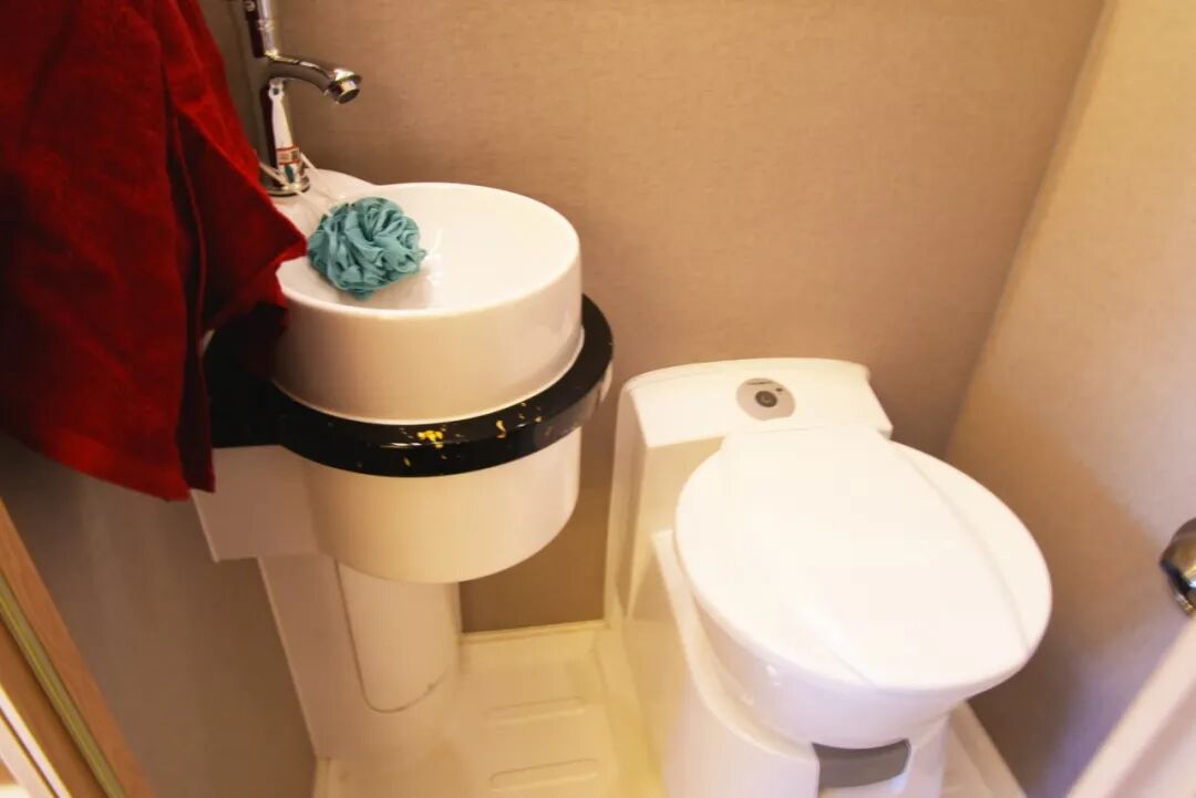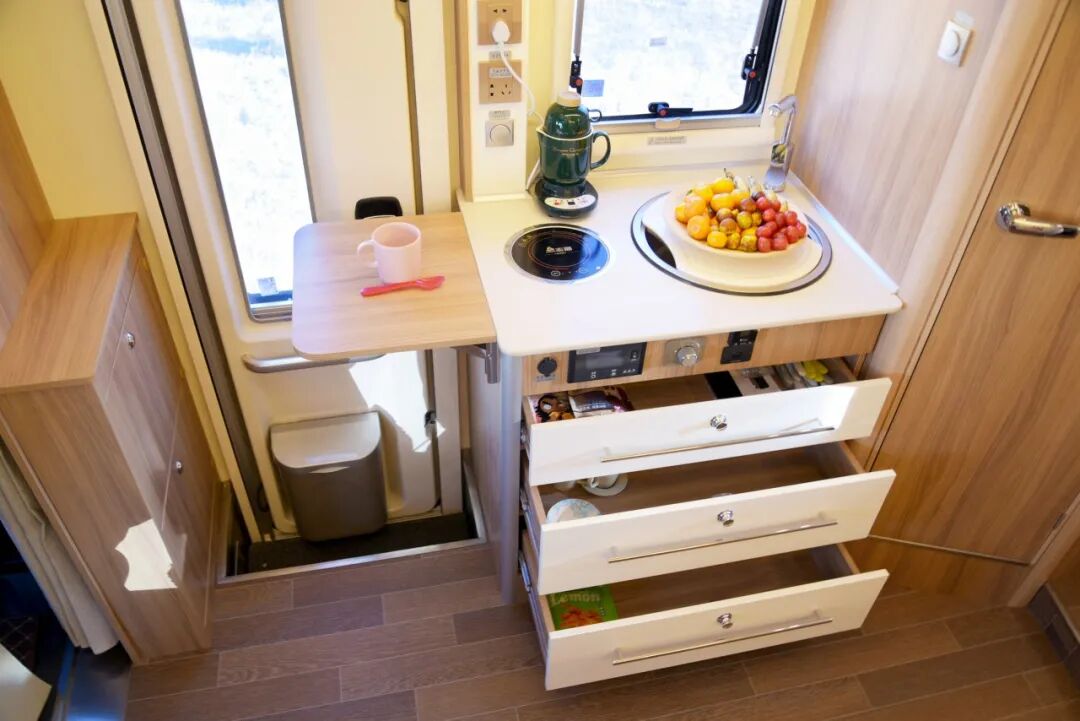 旁边的厨房空间虽小但是够用,桌面旁边还有拓展桌板可增加使用面积,盖板式洗菜盆、志高电磁炉、厨具收纳抽屉、微波炉等设施均有。另外在操作台的下方是设置有逆变开关、空调开关及暖风机开关的。