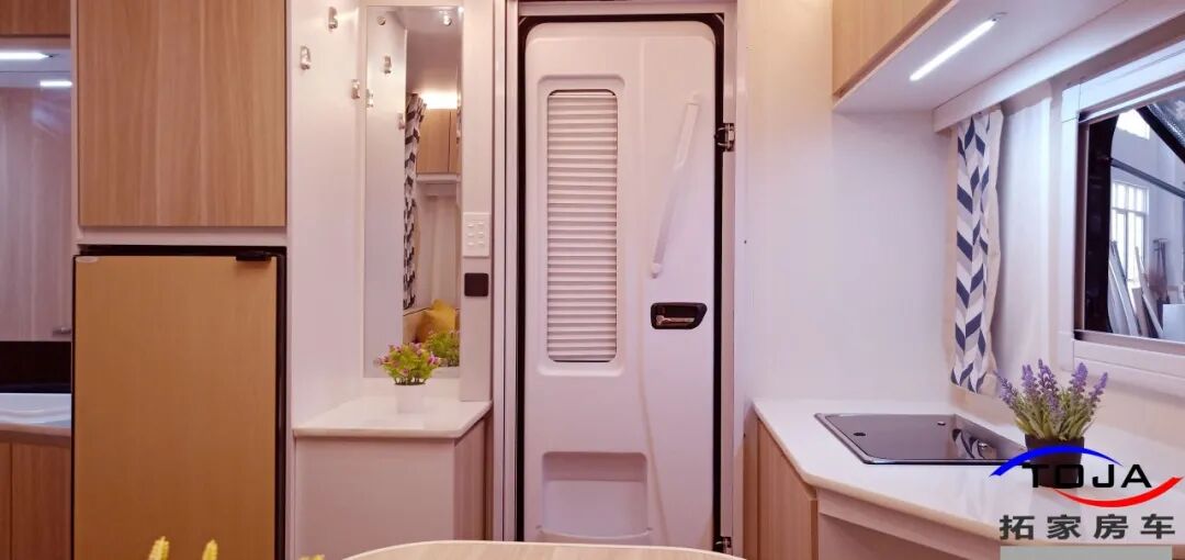 这款拓家TJ580房车外观配色上以白色为主,配上“拓家”logo相一致的颜色,简约大气。车身尺寸为5630*2170*2560mm,长度不足六米,高度为两米五左右,车身小巧,通过性也不错。