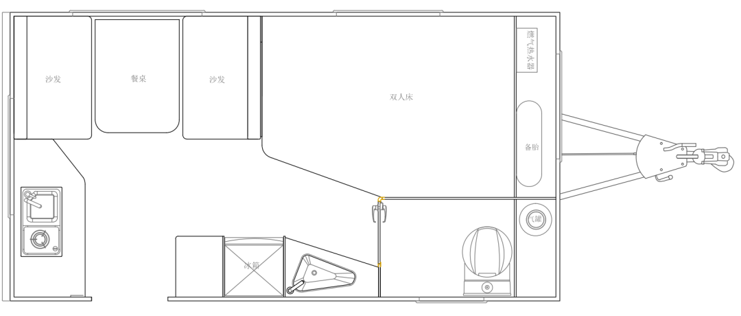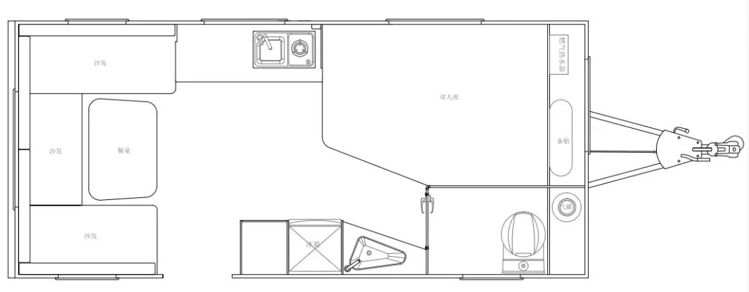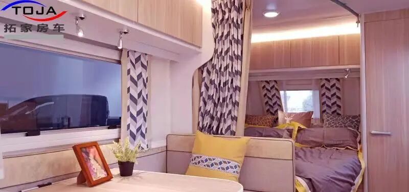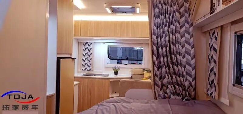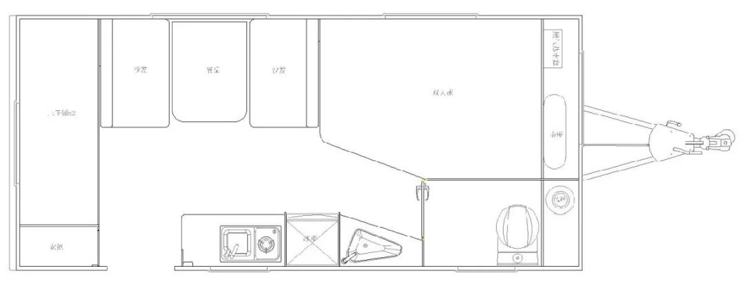 这款车型采用德国爱科整套进口底盘,配有减震器,可适应较为复杂的路况。房车厢体采用复合结构,强度大,隔音保温效果好。整车总质量为1500KG,整备质量仅为980KG,车体较轻,小车即可牵引上路。