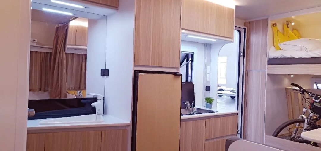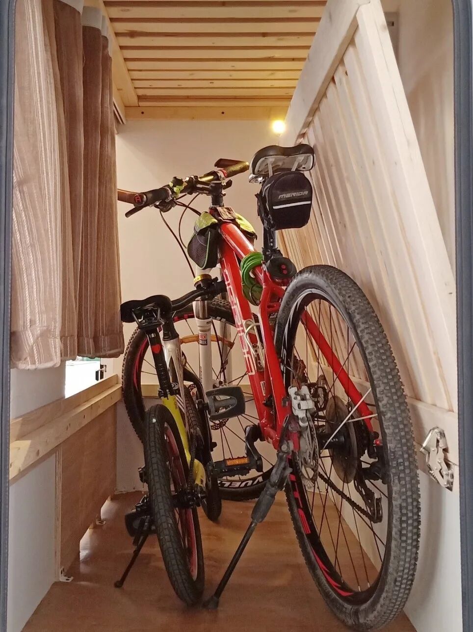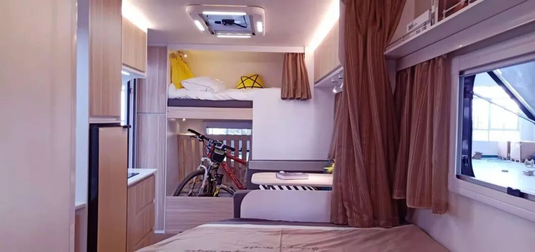 车尾是上下铺布局,可睡下两人。床铺周围配有拉帘,可形成独立、私密空间。同时下铺可以翻叠,内部空间可放置自行车等旅行行李。